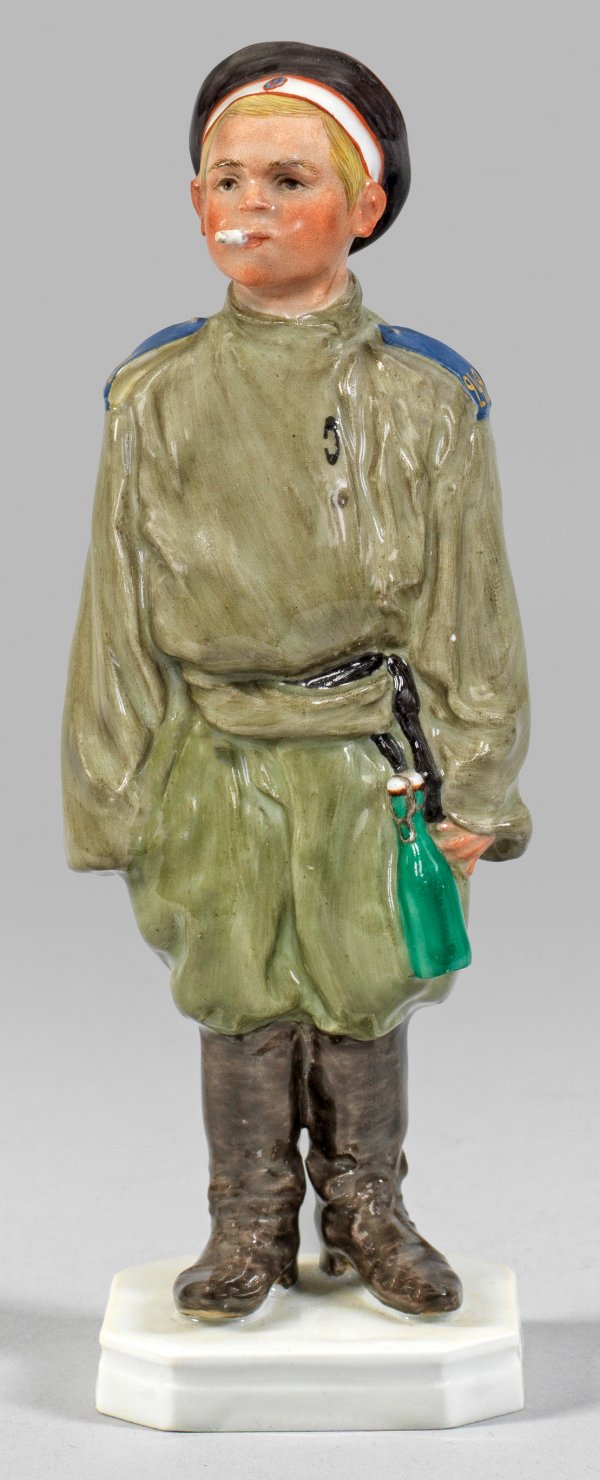 Seltene Figur "Russischer Junge". Originaltitel Auf achteckiger, profilierter Plinthe, in straffer Haltung stehender Junge in zu groß geratener Uniform mit Mütze sowie Zigarette im Mund. Polychrome Malerei. Entw. Erich Hösel, um 1915. Modell-Nr. V 160. Minim. rest.; Schwertermarke. H. 17 cm.