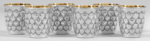 Sechs Herzbecher Silber. Konischer Korpus flächendeckend umzogen von mehrreihig versetzt angeordneten Herzen. Innen vergoldet. Gest. 925. Gew. zus. ca. 470 g. H. 7 cm.
