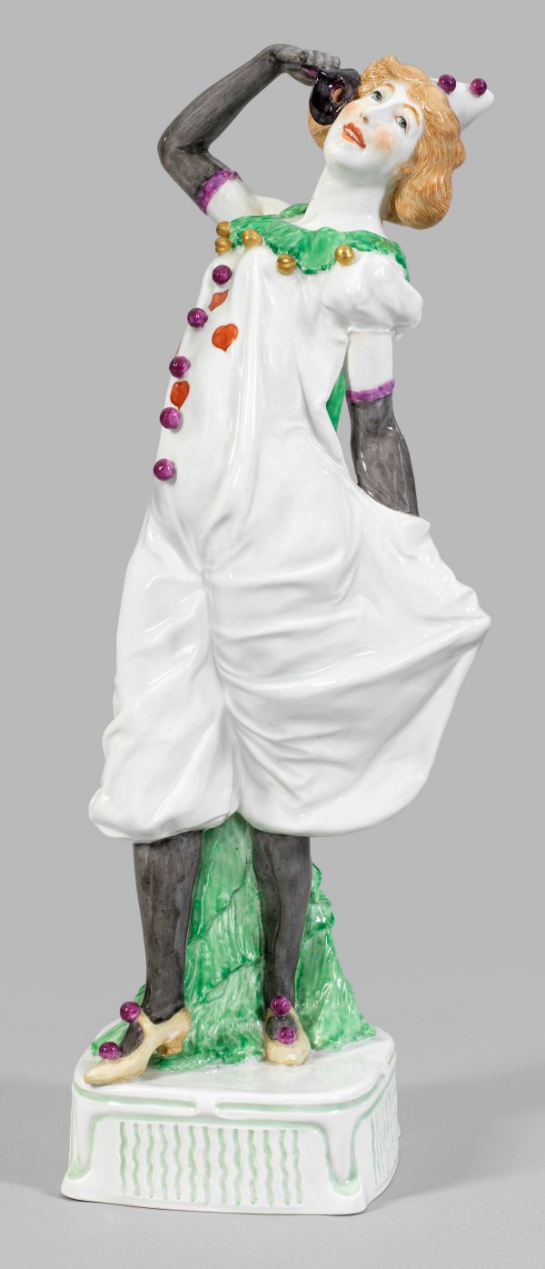 Seltene Figur "Pierrette". Originaltitel Auf quadratischem, ornamentiertem Sockel, in tänzerischer, koketter Pose stehende Pierrette in weißem, von roten Herzen und purpurfarbenen Bommeln verziertem Kostüm mit grünfarbenem Kragen und Schleppe sowie dunklen Strümpfen, langen Handschuhen und Hütchen. Ihr Gesicht in naturalistischem Inkarnat. In der erhobenen, rechten Hand eine schwarze Maske haltend. Polychrome Malerei. Entw. Martin Wiegand, 1906 - 1909. Modell-Nr. Y 165. Stand besch.; Schwertermarke. H. 37 cm.