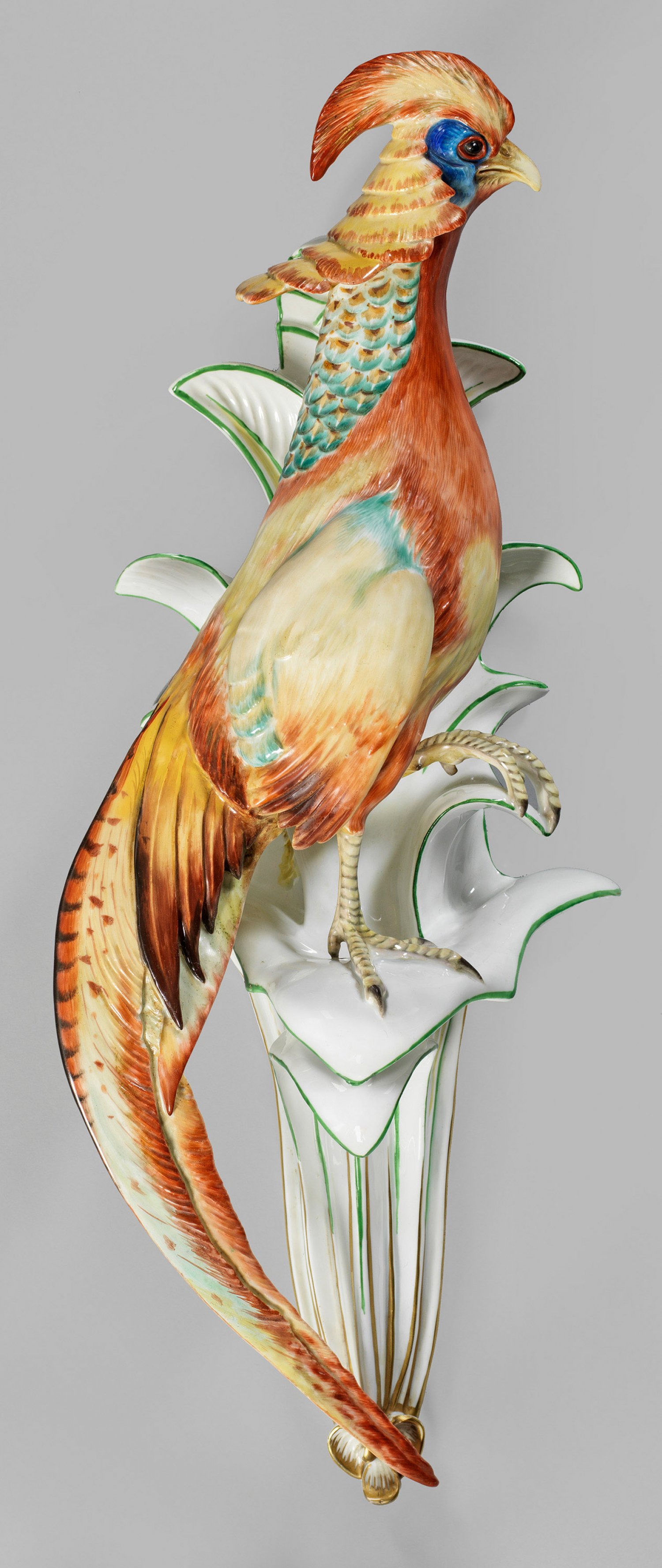 Wandplastik "Goldfasan" Auf reliefplastisch aufsteigendem, stilisiertem Blattwerk sitzender, prachtvoller Goldfasan. Vollplastische, naturgetreue Darstellung mit detailreicher, farbenprächtiger Gefiederzeichnung. Polychrome Malerei mit Goldstaffage. Entw. Paul Walther, 1929. Modell-Nr. L 247. Rest.; Schwertermarke. H. 56 cm.