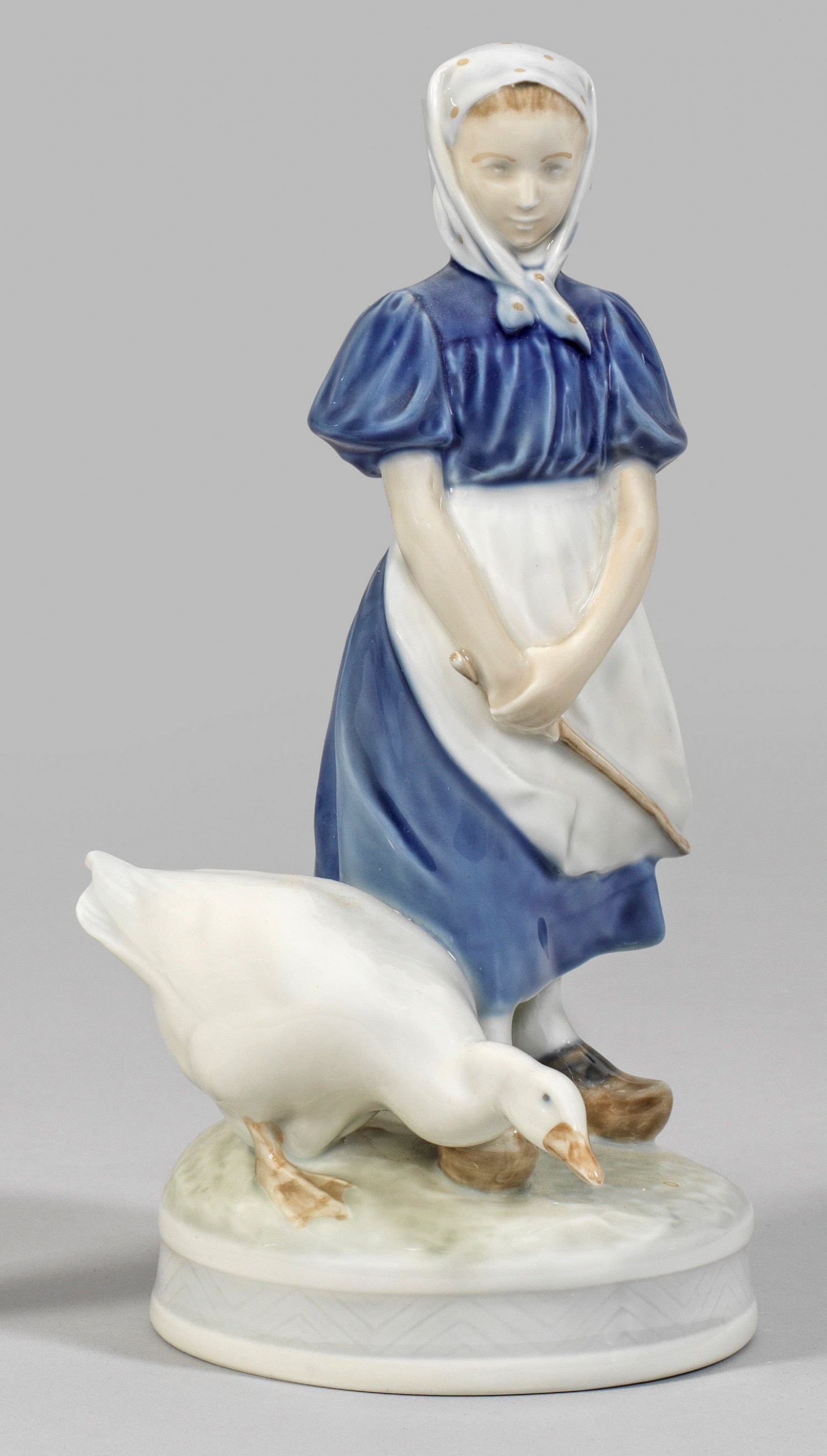 Gänsemädchen mit Kopftuch, auf rundem Natursockel stehend. Polychrome Unterglasurmalerei. Entw. Christian Thomsen. Entw.-Monogr.; Modell-Nr. 527. Manufakturmarke. H. 23,5 cm.