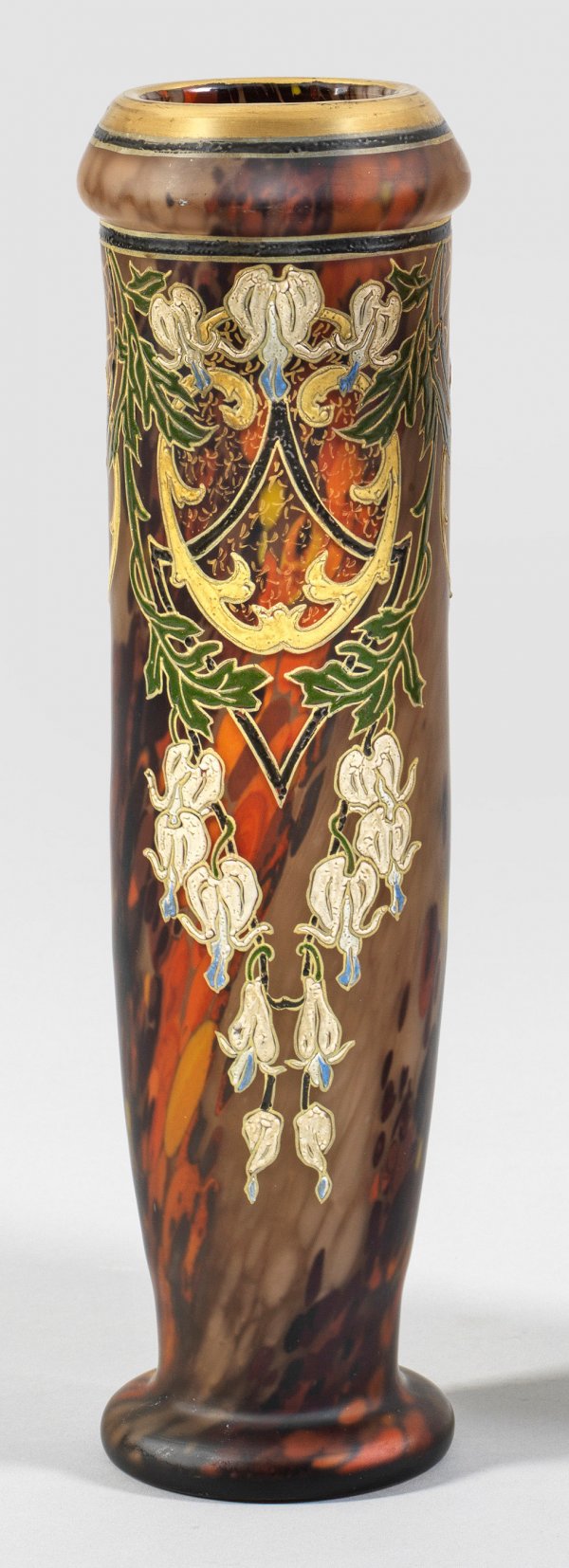 Schlanke Becher- bzw, Stangenform mit ausgestelltem Fuß und akzentuierter Mündung. Farbloses Glas, Unterfang mit polychromen Pulver- bzw. Kröseleinschmelzungen. Stilisierter Dekor in Gold und polychromer Reliefemailmalerei aus Festons mit Ornamenten und Tränendem Herz. Sign. "LegrAS" in Gold. H. 35 cm.