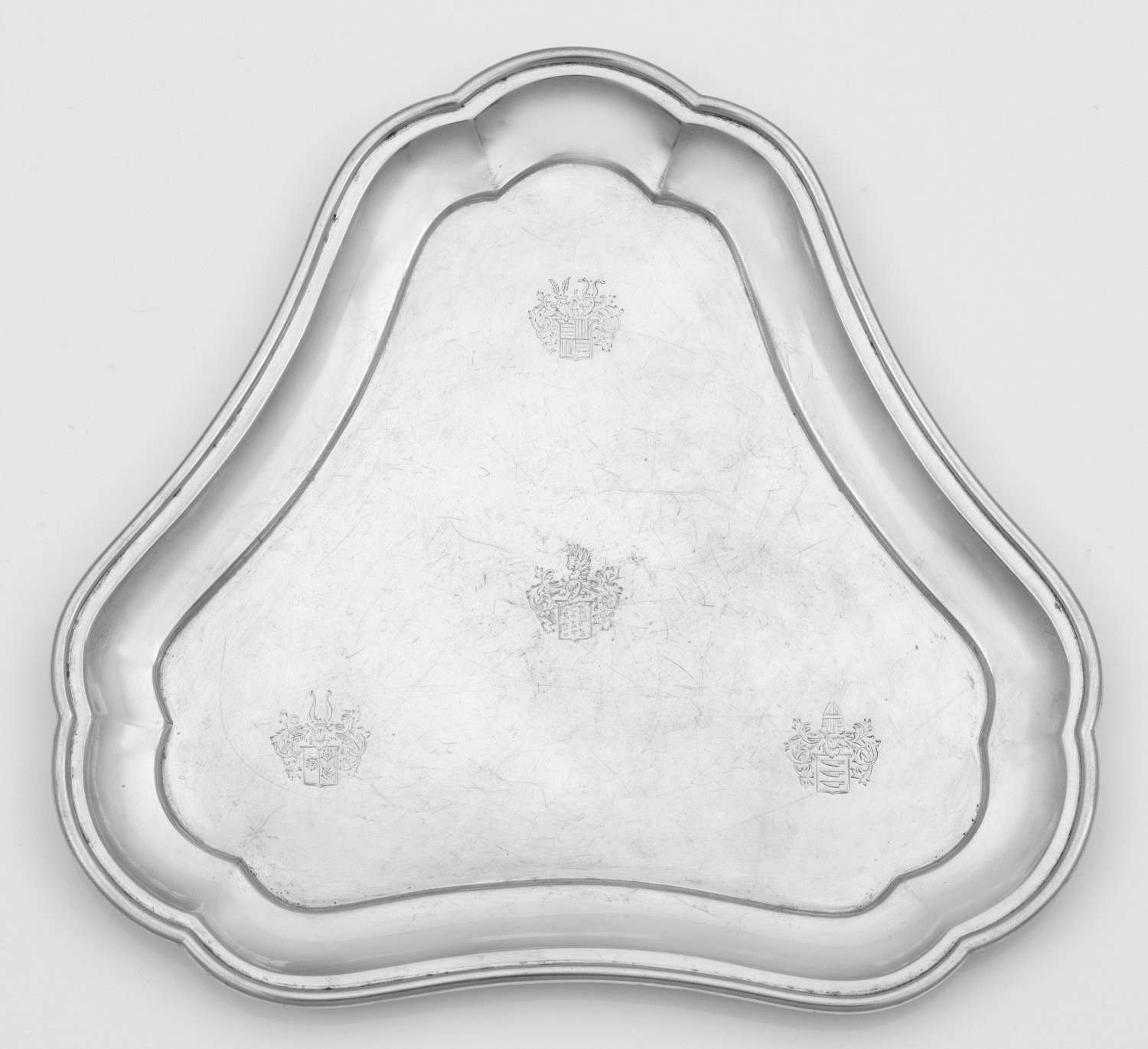 Souveniertablett mit Adelswappen Silber. Dreipassiges Tablett mit einfach profiliertem Rand. Im glatten Spiegel vier Adelswappen fein graviert. Unterseitig dazugehörige Namensgravuren: "Freiherr von Fürstenberg-Stammheim, von Quast, von Krosigk, Freiherr von Schleinitz, Zur Erinnerung an Klein Glienicke 1906 - 1911". Gest. 800, Herstellerzeichen GEBR. FRIEDLÄNDER. Gew. ca. 288 g. 23,5 cm x 22 cm.
