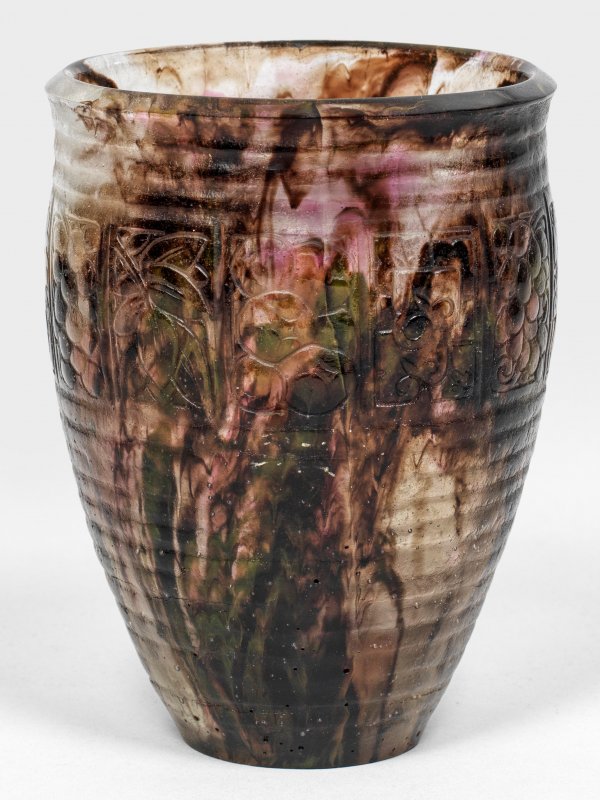 Glockenbecherform. Pâte de cristal, formgeschmolzen, teilw. nachgeschliffen und poliert. Marmorierte Wandung aus farblosem Glas mit Äderungen in Violett und Braun. Gerillte Wandung, oberhalb ein umaufendes Dekorfriesband aus flach reliefierten Rechteckfeldern mit unterschiedlichen, stilisierten Blatt- und Früchtemotiven. Tiefgepresste Marke; Werk-Nr. A 319. H. 18 cm.