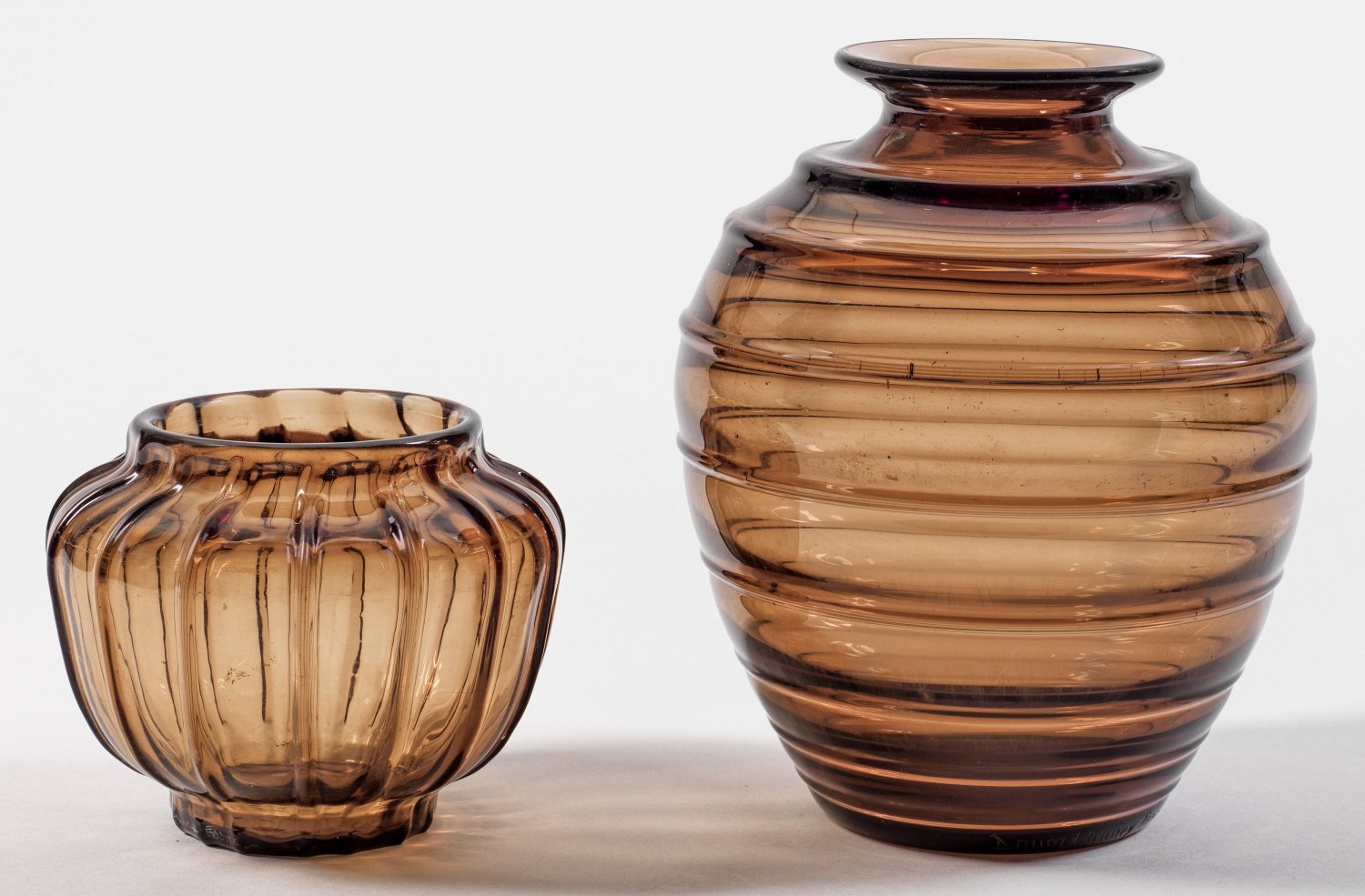 Zwei Vasen von Daum Ovoide bzw. gebauchte Form. Rauchfarbenes, längsoptisch geblasenes bzw. horizontal geripptes Glas. Geschnittene Sign. "DAUM NANCY FRANCE" mit Lothringer Kreuz. H. 14,5 cm-27 cm.
