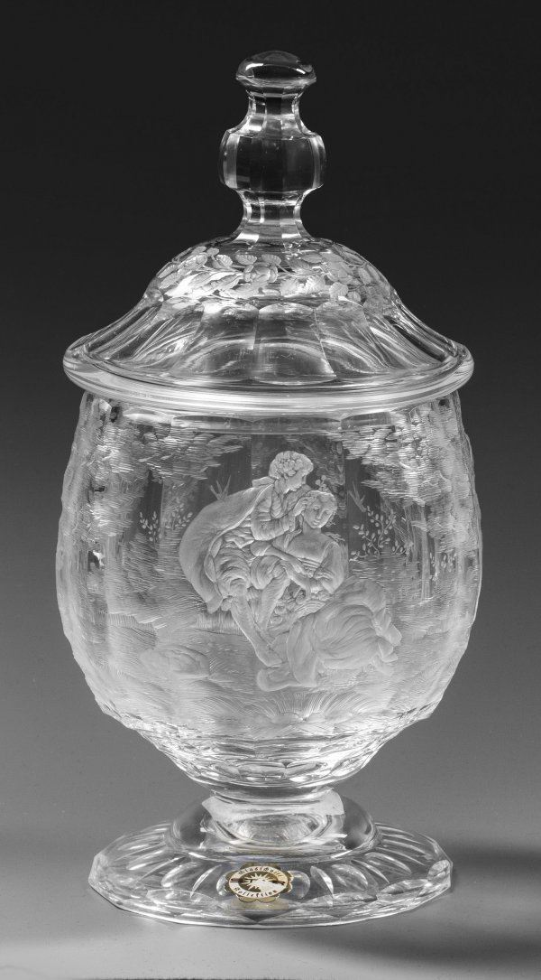 Bonbonniere mit Schnitt von Schwamberger Farbloses Kristallglas, geschliffen. Gefußte Kugelform mit glockenförmigem Deckel und Balusterknauf. Reicher, fein geschnittener Dekor aus einer Watteauszene mit jungem Liebespaar in Landschaft, auf dem Deckel ein Kranz aus Rosen. Etikett "Glasschnitt STAR Kollektion". H. 25 cm.