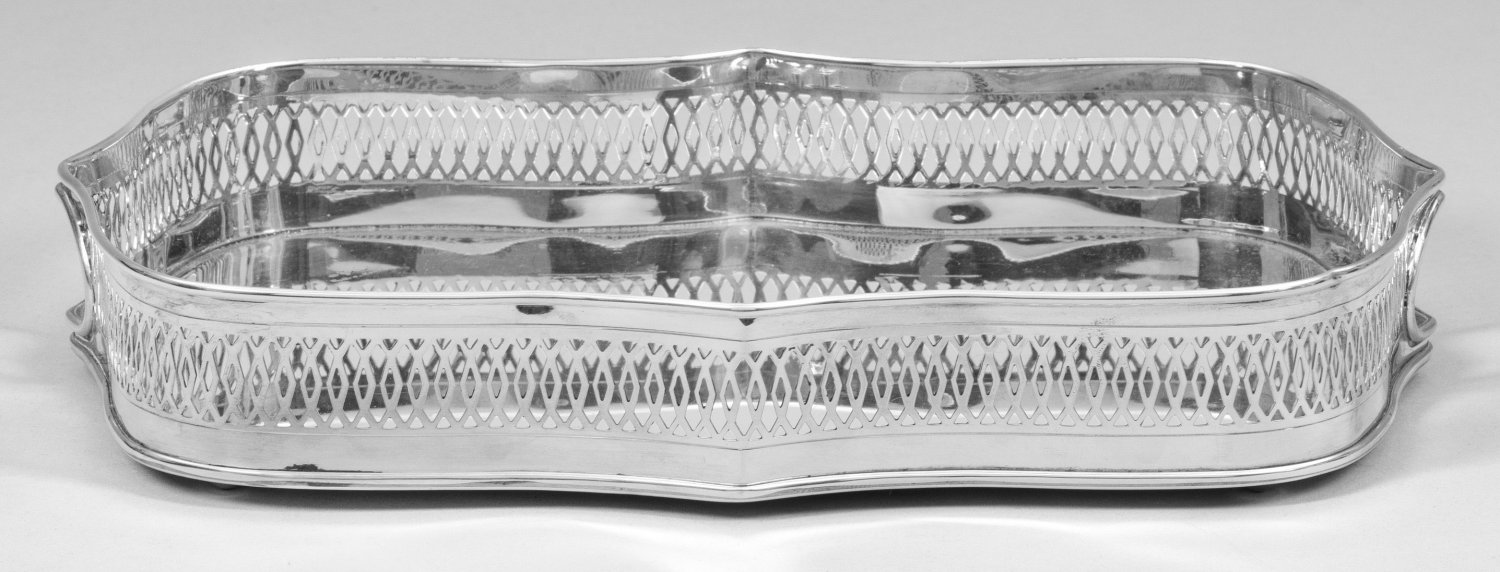 Galerietablett Silber. Auf vier Füßen geschweifte, glatte Bodenplatte, umzogen von netzgitterartig durchbrochen gearbeitetem Rand. An den Schmalseiten kleine Griffmulden. Gest. 925, Herstellerzeichen. Gew. ca. 640 g. 31 cm x 23 cm.
