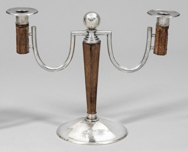 Art Déco-Girandole Silber, Holz. Auf gewölbtem Stand mit Hammerschlagdekor, sechsseitiger konischer Holzschaft. Darüber getreppte Fassung mit einer Kugel bekrönt. Davon ausgehend zwei geschwungene Leuchterarme mit in Holz gefassten Tüllen mit silbernen Traufschalen. Gest. 800, Herstellerzeichen. Gew. zus. ca. 550 g. H. 25,5 cm.