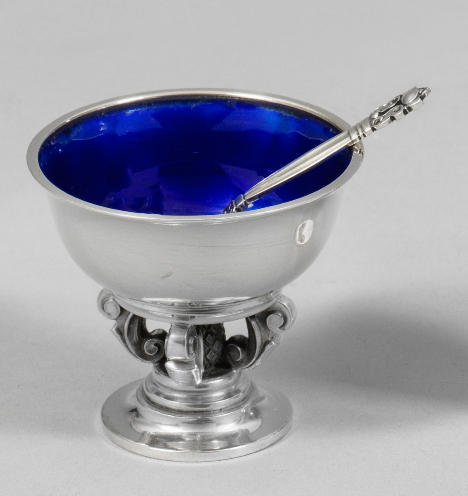 Georg Jensen-Salzschälchen "Acorn" mit Löffel. Silber. Schale auf vier Blattfüßen, darunter ein vollplastischer Zapfen. Innenwandung nachtblau emailliert. Modell 741. Entw.: Johan Rohde. Gest. Sterling, Herstellerzeichen, Designersignet. Gew. ca. 70 g. H. 4,8 cm.