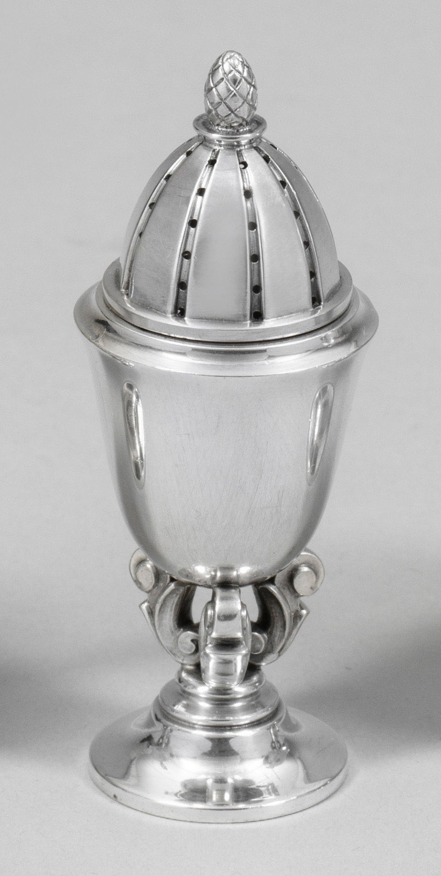 Georg Jensen-Salzstreuer "Acorn" Silber. Vasenförmiger Korpus auf drei Blattstützen, darunter eine Kugel. Zapfenbekrönung. Deckel mit Bajonettverschluss. Modell 741. Entw.: Johan Rohde. Gest. Sterling, Herstellerzeichen, Designersignet. Gew. ca. 51 g. H. 8,6 cm.