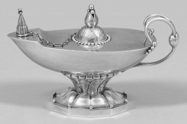 Georg Jensen-Öllampe Silber. Nach antikem Vorbild geformte Lampe mit martelliertem Tank in Schiffchenform auf zehneckigem Fuß mit plastischem Blatt-Beeren-Muster. Deckelknauf als geöffnete Knospe. Modell 12. Gest. Sterling, Herstellerzeichen. Gew. ca. 177 g. H. 8,8 cm. B. 13,5 cm.