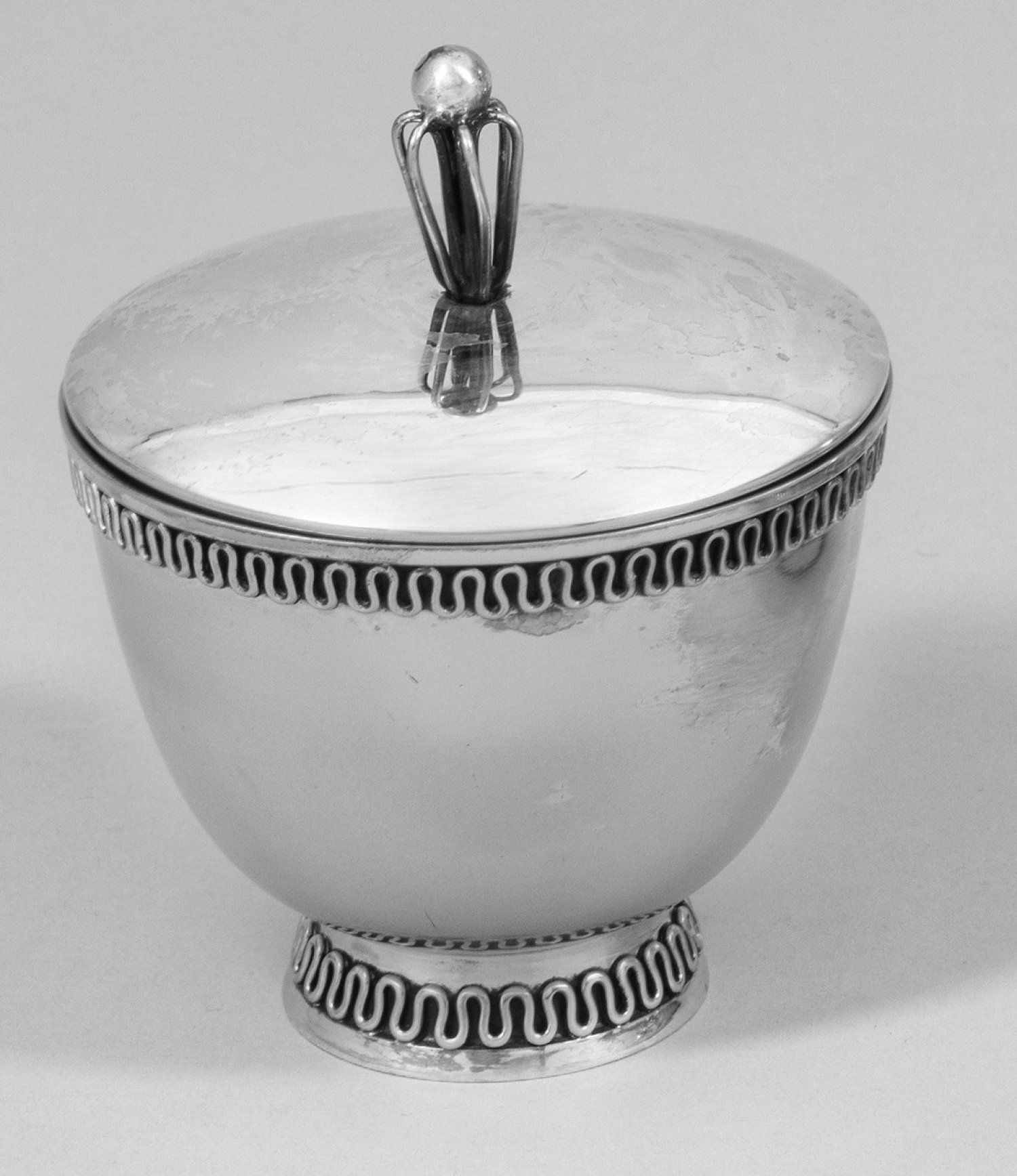 Bonbonniere Silber. Auf rundem kegelförmigem Stand, glockenförmiger Korpus gerahmt von umlaufendem aufgelegtem Wellenband. Gewölbter Deckel bekrönt mit Kugelknauf. Gest. 800, Herstellerzeichen. Gew. ca. 215 g. H. 12 cm.