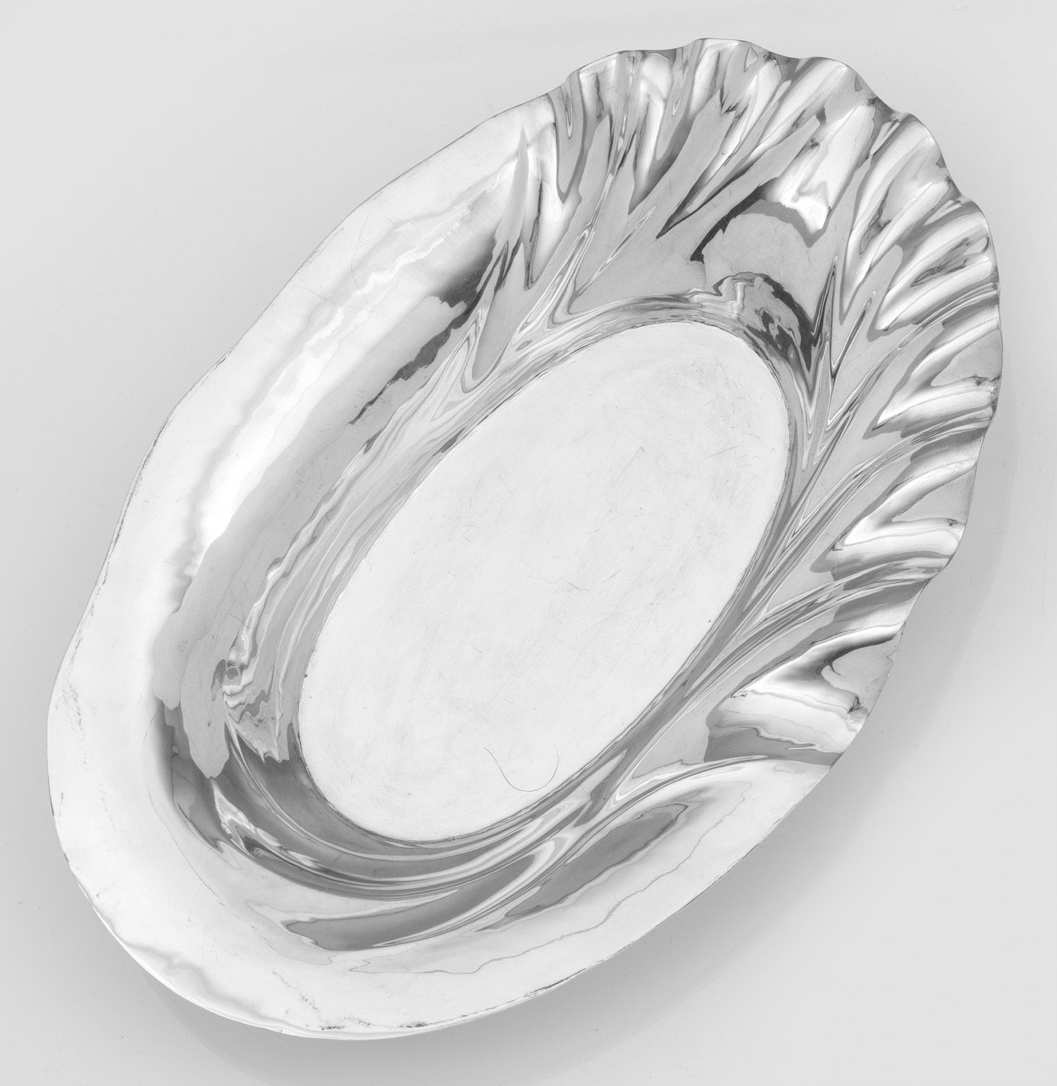 Gebäckschale Silber. Asymmetrische Blattform mit glatter Oberfläche. Gest. 900. Gew. ca. 412 g. L. 32 cm.