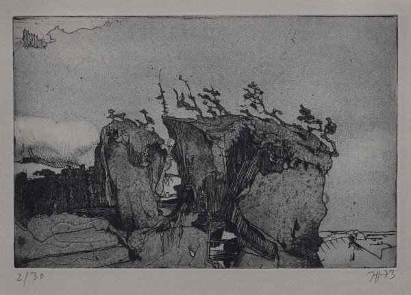 Radierung u. Aquatinta/hellgraues Papier, 1971/73. Sign., nummeriert 2/30 u. dat. (19)73. Aus der Propylaen-Mappe "Landschaften". Plattenmaß 24,2 cm x 21,3 cm; Blatt 28,2 cm x 40 cm.