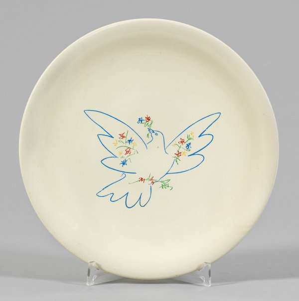 After Pablo Picasso (1881 - 1973). A glazed French Salins pottery earthenware plate with a polychrome decoration of the dove of peace. Inscribed, manufacturer's mark.