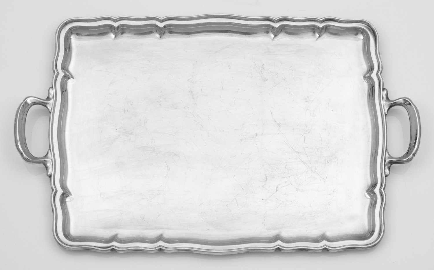 Großes Serviertablett Silber. Glatter Spiegel, übergehend in geschweiften, getreppt ansteigenden Rand. Hochgezogene Bandhenkel. Minim. Gebrauchsspuren. Gest. 800, Herstellerzeichen. Gew. 1680 g. 56 cm x 35 cm.