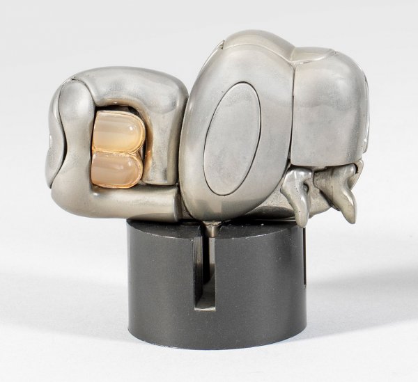 Puzzle-Figur aus vernickeltem Metall mit integriertem Ring. Schwarzer Kunststoffsockel. Sign.-Stempel; Eines von 9500 Exemplaren. H. 5 cm; Ges.-H. 7,5 cm.
