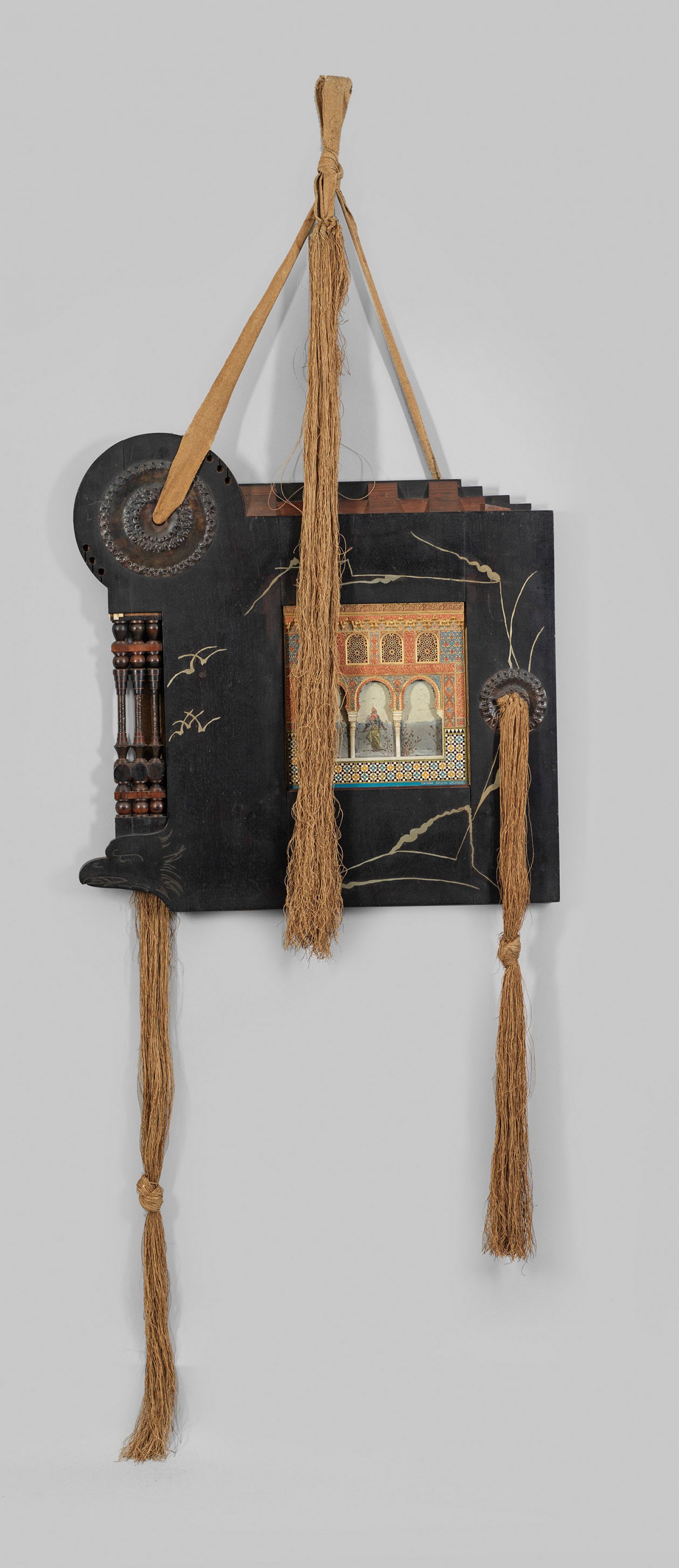 Gegenstück zur folgenden Position. Ebonisiertes Holz und Nussbaum mit Einlagen aus Zinn. Ornamentierte Applikationen aus Kupferblech sowie polychrom bemalte und teilw. vergoldete Stuckelemente. Rechteckiges Paneel mit stilisiertem Zinnenabschluss. Einseitig über graviertem Adlerkopf ausgesparte Reserve mit drei eingestellten, teilw. von geprägtem Kupfer umwickelten Vollsäulen sowie oberhalb großes Kreiselement mit appliziertem Tondo. Flächendeckender Dekor aus lose arrangierten Zweigmotiven und stilisierten Vögeln. In der Mitte eingelassene Plakette mit reliefplastisch gestaltetem Architekturelement aus maurischem Arkadenbögen, fein gegliederten Gitterfenstern sowie reich gestalteten Ornamentfriesen und Kalligraphiekartuschen, bez. No. 3, Enrique Linares Granada als Rahmung für bemalte Metallplakette mit stilisierter Landschaftsdarstellung und junger Orientalin mit Baumwollpflanzen, rechts unten sign. Pellegrini. Aufhängung aus Gutband sowie Dekorationen aus überlangen Quasten. Ges.-H. 227 cm x 79 cm.