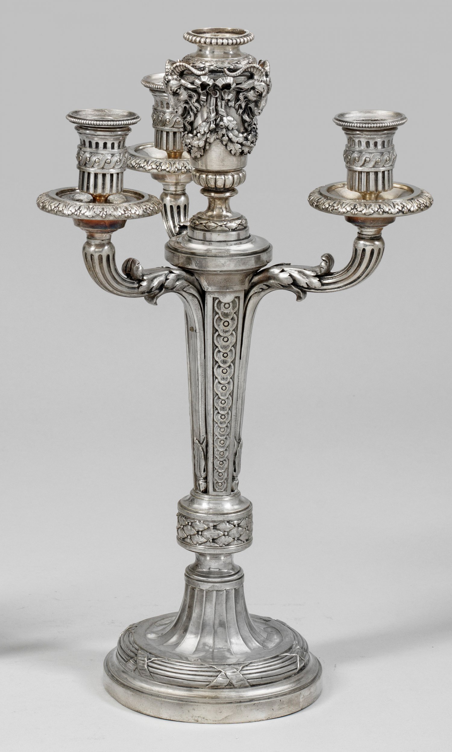 Prunkgirandole im Louis XVI-Stil Versilbert. 4-flg.; Über rundem Fuß mit üppigem Blatt- und Lorbeerrelief verzierter, nach oben geweiteter Schaft, aus dem sich drei als Akanthusranken gestaltete Leuchterarme entwickeln. Die zentrale Mitteltülle in Form einer sehr fein mit plastischen Widderköpfen und Eichenlaub-Girlanden verzierten Vase gearbeitet. H. 45 cm.