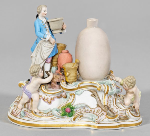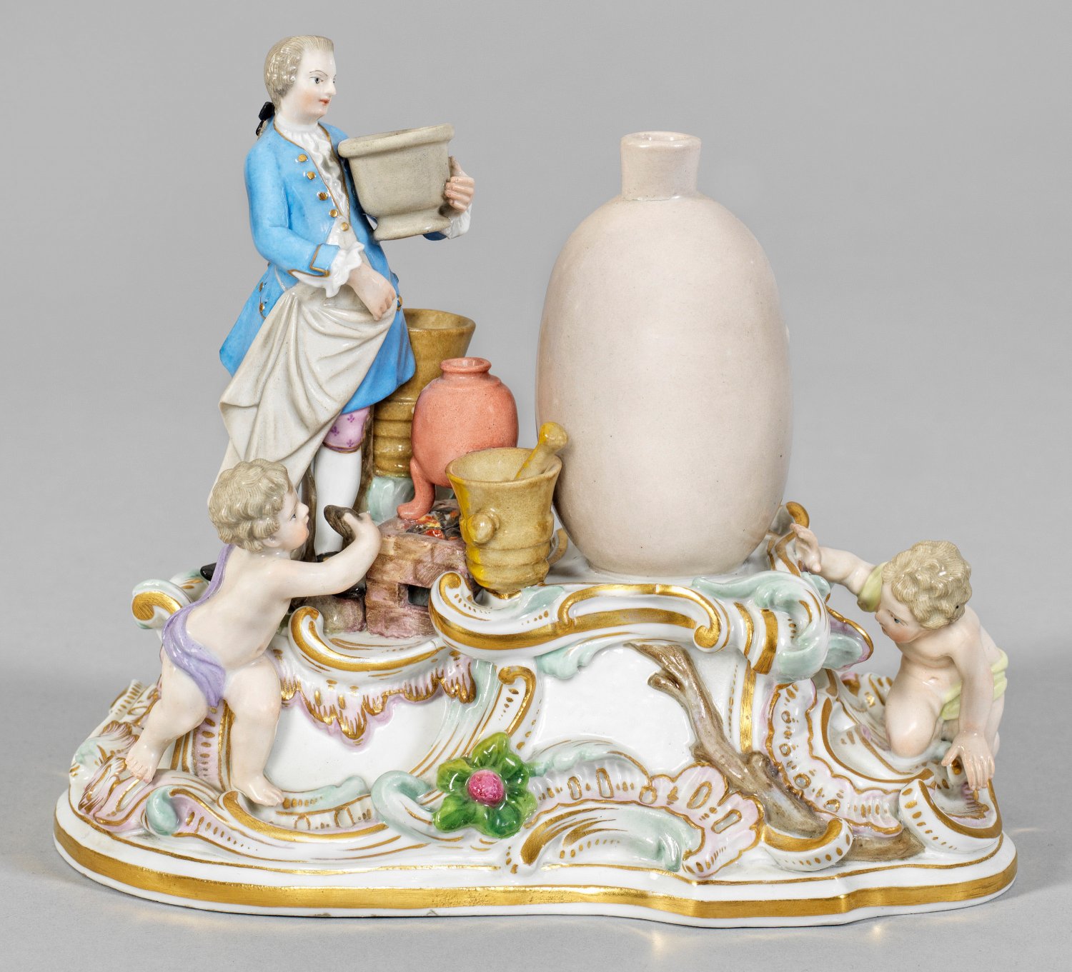 Äußerst seltene Gruppe "Der Alchimist". Originaltitel Auf unregelmäßigem, in großen reliefplastischen Rocaillen aufsteigendem Podestsockel stehender Alchimist inmitten verschiedener Gefäße mit Substanzen, Mörser mit Stößel sowie einer großen Vase, in der linken Hand eine Schale haltend. Zu seinen Füßen, über gemauerter Feuerstelle stehendes Dreibeingefäß. Seitlich herannahender Putto mit Kohlestück bzw. eine sich versteckende Amorette, die Szenerie aus der Ferne beobachtend. Polychrome Malerei mit reicher Goldstaffage. Modell-Nr. 1705. Schwertermarke. H. 16,5 cm.