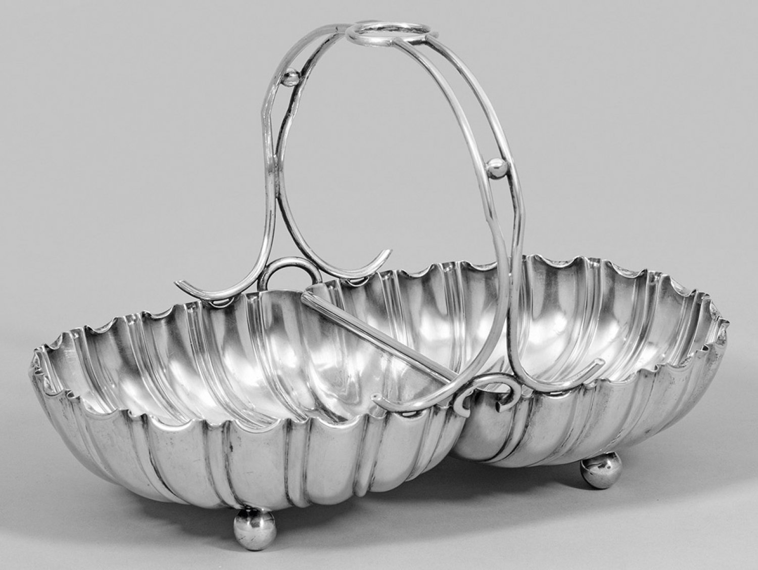 Gebäckschale Silber. Dekorativ gestaltet in Form zweier gegenständiger, stilisierter Muscheln. Übergreifender, aus zwei Streben gearbeiteter Henkel. Gest. 800, Herstellerzeichen. Gew. ca. 850 g. 29,5 cm x 19 cm.