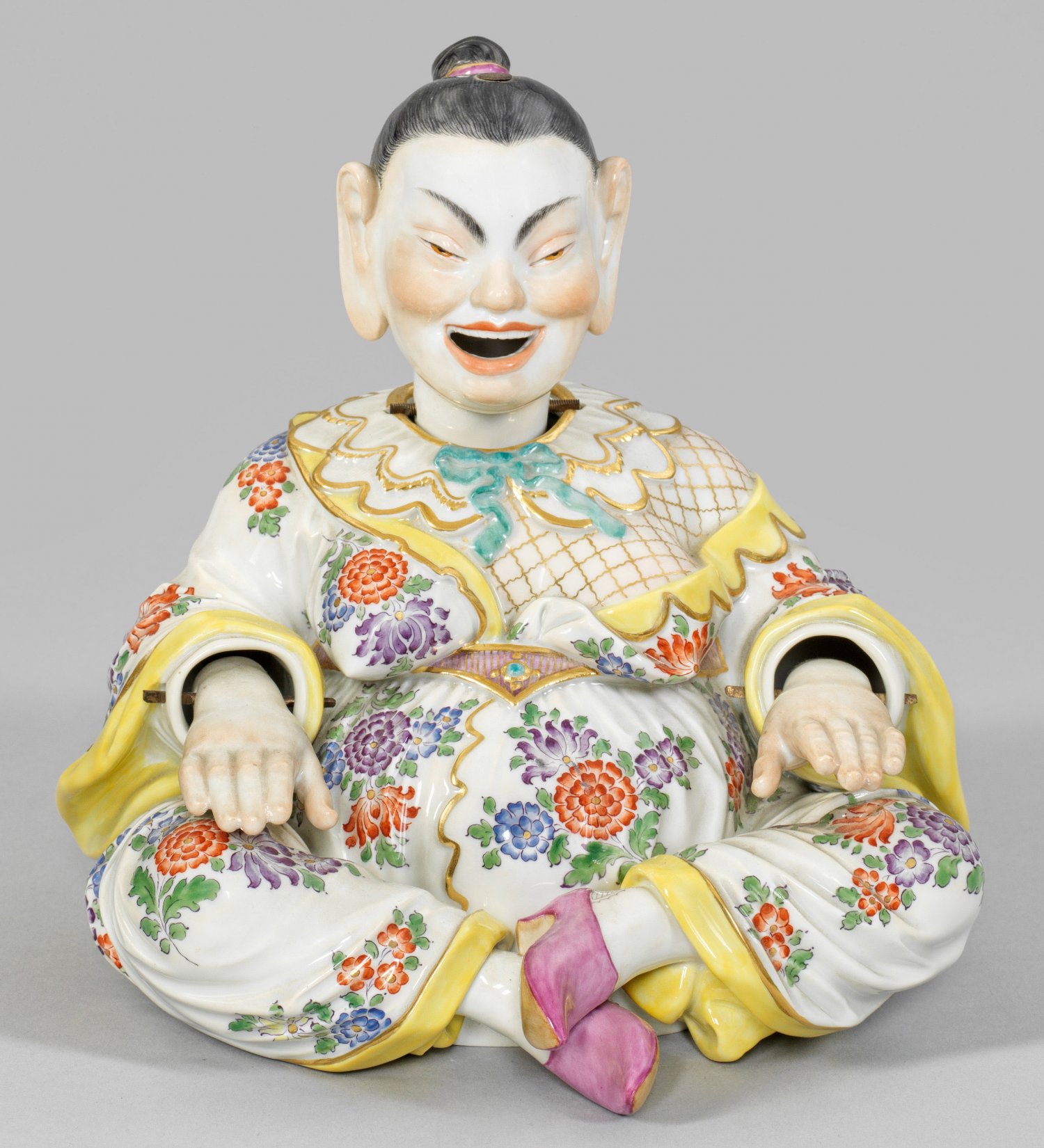 Weibliche Wackelpagode Mit verschränkten Beinen sitzende Chinesin in einem gelbgesäumten, weißen und von großen Indianischen Blüten verzierten Gewand mit goldornamentiertem Spitzenkragen, purpurfarbenen Pantoffeln und einem edelsteinbesetztem Gürtel, das Haar rückseitig zum Zopf geknotet. Hände, Kopf und Zunge beweglich. Polychrome Malerei mit Goldstaffage. Entw. Johann Joachim Kaendler. Schwertermarke. H. 18 cm.