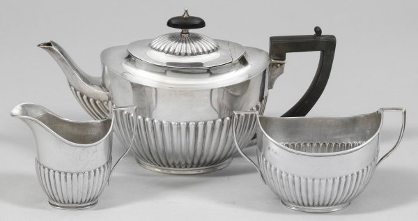 Englisches Teeservice Silber. 3-tlg.; Tee-, Sahnekanne und Zuckerdose im Queen Anne-Stil. Ovoid mit abgesetztem Hals. Untere Wandungshälfte umzogen von Stabfries. Teekanne mit mittig angesetzter Tülle, rückseitig gekanteter Bandhenkel. Beschaumarken, Ältermannbuchstaben, Herstellerzeichen. Gew. ca. 904 g. H. 9,3 cm - 15,5 cm.