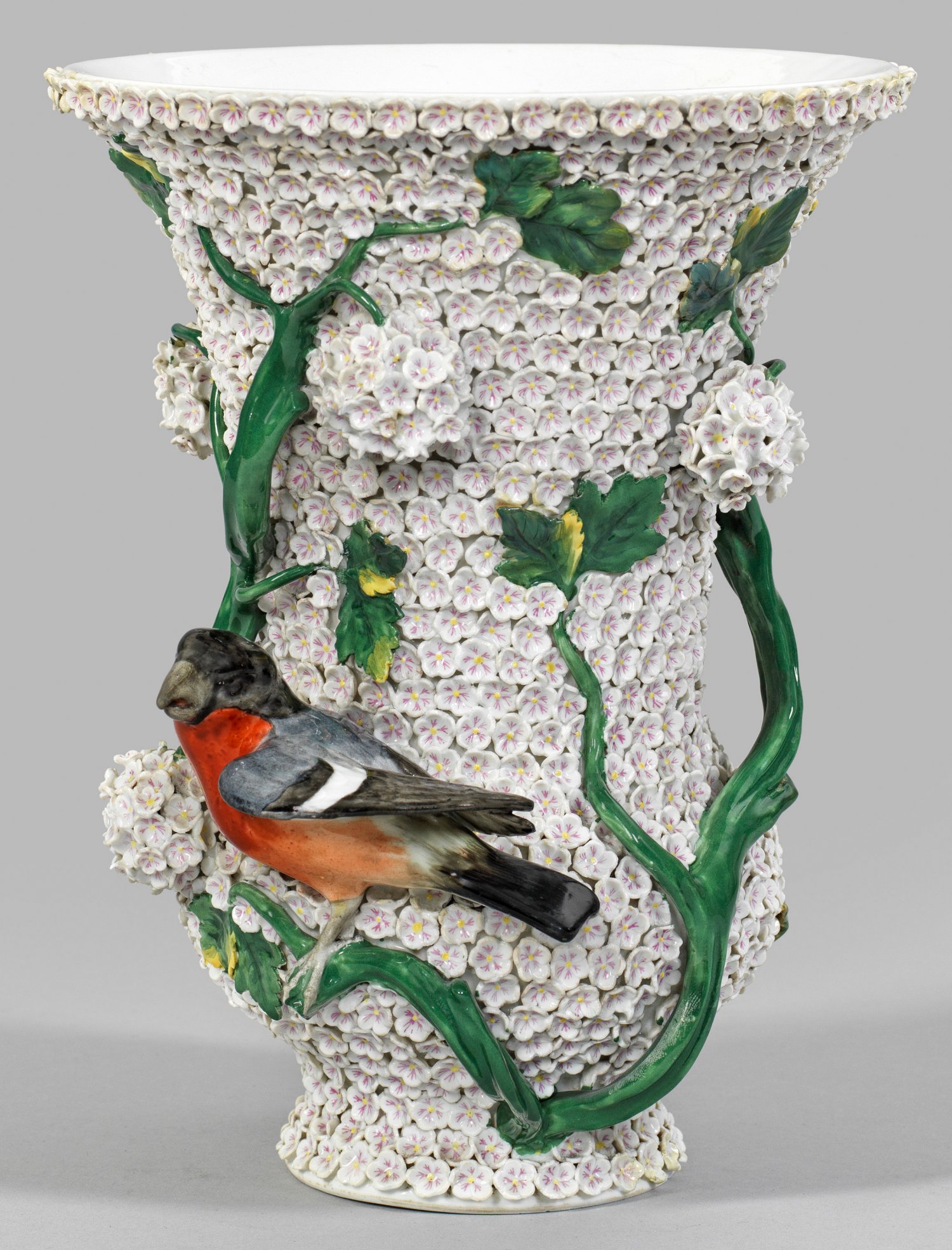 Ziervase mit Schneeballendekor Gebauchter, sich trichterförmig erweiternder Korpus. Flächendeckender Fond aus dicht aufgelegten, gelb und purpurfarben staffierten Schneeballblüten, umzogen von plastischen, sich verzweigenden Blattranken mit großen Blütendolden und Gimpel. Polychrome Malerei mit Goldrand. Minim. best.; Teilw. rest.; Schwertermarke. H. 25,5 cm. Mündungs-D. 18,5 cm.