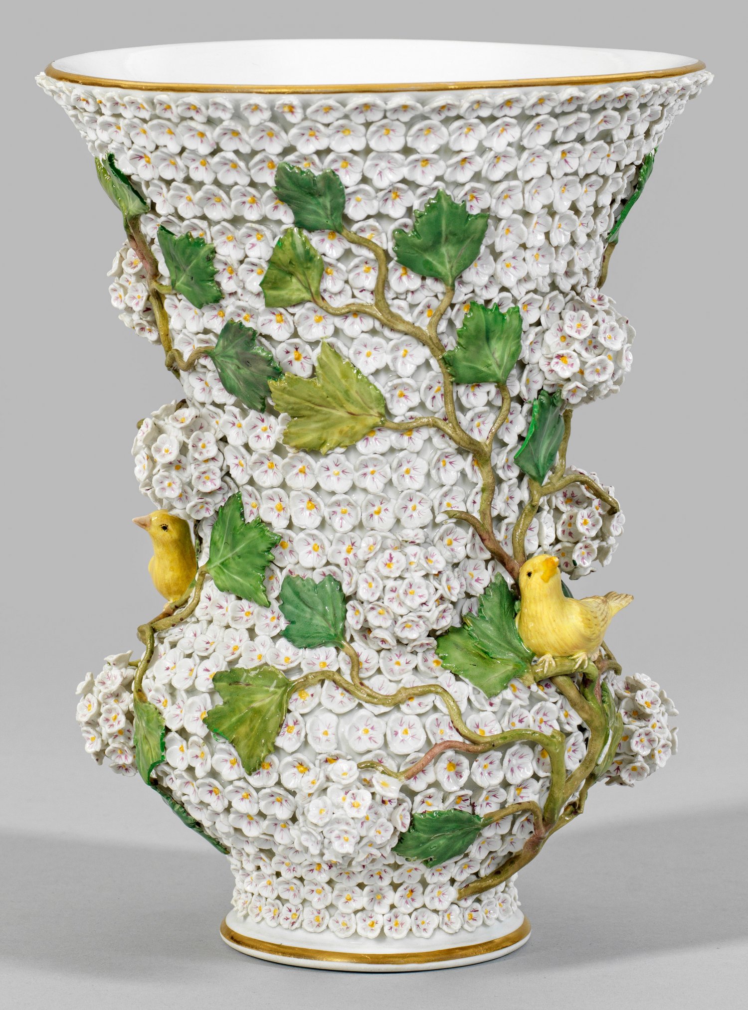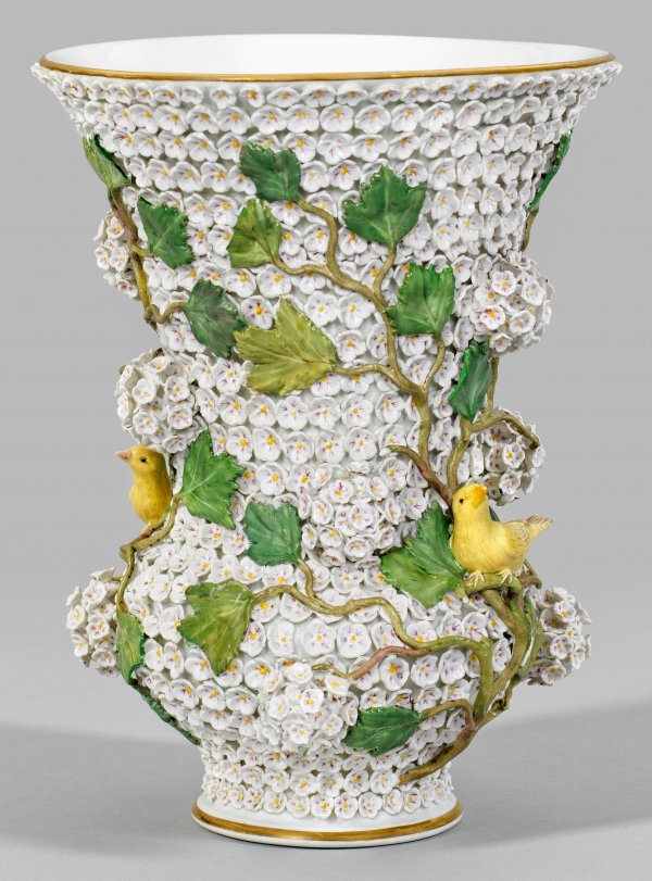 Ziervase mit Schneeballendekor Gebauchter, sich trichterförmig erweiternder Korpus. Flächendeckender Fond aus dicht aufgelegten, gelb und purpurfarben staffierten Schneeballblüten, umzogen von plastischen, sich verzweigenden Blattranken mit großen Blütendolden und Kanarienvögeln. Polychrome Malerei mit Goldrand. Minim. besch.; Schwertermarke. H. 25 cm. Mündungs-D. 18,5 cm.