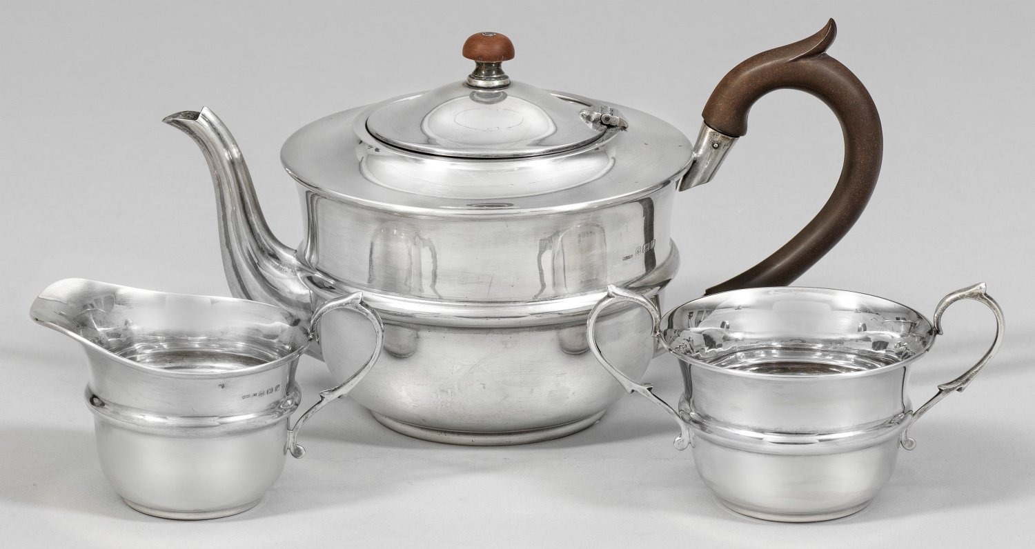 Englisches Art Déco-Teeservice 3-tlg.; Silber. Teekanne, Zuckerdose, Sahnegießer. Elegante, glatte Form, Korpus durch ringförmig umlaufende Godrone gegliedert. Griff und Knauf aus braunem Bakelit. Gest. Stadt- und Herstellerzeichen, Ältermannbuchstabe. Gew. ca. 588 g. H. ca. 14,5 cm (Kanne).