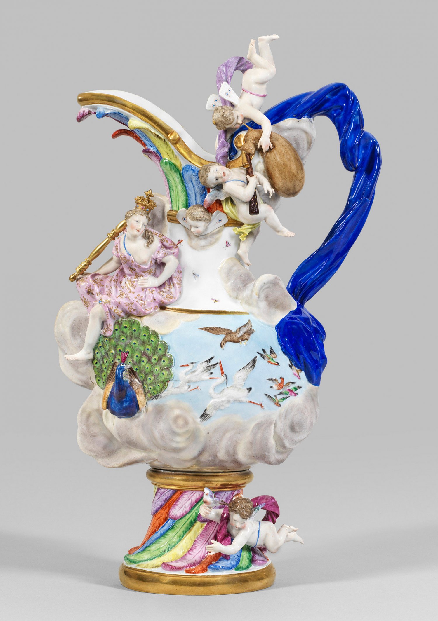 Große prächtige Elementvase der "Luft" in Form einer Schenkkanne. Aus der Serie die "Vier Elemente". Über ovalem Fuß bauchiger Korpus mit abgesetztem, eingezogenem Hals und reliefiertem Ausguss. Seitlich tuchförmig gebauschter, königsblau staffierter Henkel. Schauseitg stark reliefierter, teilw. vollplastisch modellierter Dekor aus verschiedenen mythologischen Figuren und Elementen, die Luft symbolisierend. Ausguss und Fuß umzogen von Federreliefs. Zwischen reliefplastischen Wolken fliegende Kraniche, Enten und Adler sowie vollplastische Putten mit Taube bzw. Dudelsack. Seitlich sitzende, bekrönte Göttin Juno mit Zepter in antikisierendem, rosafarbenem, von Goldblüten gemustertem Gewand, begleitet von einem Pfau als ihr Attribut. Am Kannenhals Insekten und Schmetterlinge auf weißem Fond. Feine polychrome Malerei mit Goldrand. Entw. Johann Joachim Kaendler, um 1741 - 1742. Unw. rest.; Schwertermarke. H. 64 cm.