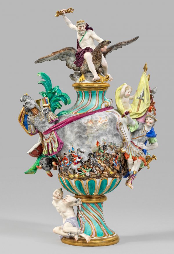 Große Elementvase "Feuer" Über rundem Fuß birnförmig gebauchter Korpus mit gerundeter Schulter, eingezogenem Hals und profiliertem Lippenrand, umzogen von verschiedenen Ornamentfriesen. Aufgewölbter Deckel, bekrönt von vollplastischer Darstellung des Göttervaters Jupiter mit Blitzbündel, auf einem Adler reitend. Auf der Schauseite reliefplastische, szenische Darstellung einer Schlacht des 18. Jhs.; Vor der Kulisse einer Ortschaft in Feuerbrunst, zwischen aufsteigenden Rauchwolken kämpfende Kavalleristen und gefallene Soldaten. Flankierend applizierter, plastischer Dekor mit Figur des behelmten Kriegsgottes Mars in römischem Harnisch zwischen Fahnen, Speeren und Feldtrommel, begleitet von einem Genius bzw. großer Kriegstrophäe aus Rüstung und Helm, umgeben von Fahnen, Feuerkugel und Trommeln als Symbole des Triumphes. Am Fuß sitzender, gefesselter Gefangener. Rückseitig, zwischen feinem Streublumendekor, reliefierte Kartuschenrahmung mit Inschrift "DIEU ET MON DROIT" ("Gott und mein Recht") auf mattblauem Fond, Maxime der englischen Krone, die auf die Regierungszeit Heinrich VI. (1422 - 1461) zurückgeht, der sowohl zum König von England als auch zum König von Frankreich gekrönt wurde. Umlaufend Ornamentbordüren. Polychrome Malerei mit reicher Goldstaffage. Entw. Johann Joachim Kaendler. Rest.; Schwertermarke. H. 64 cm.