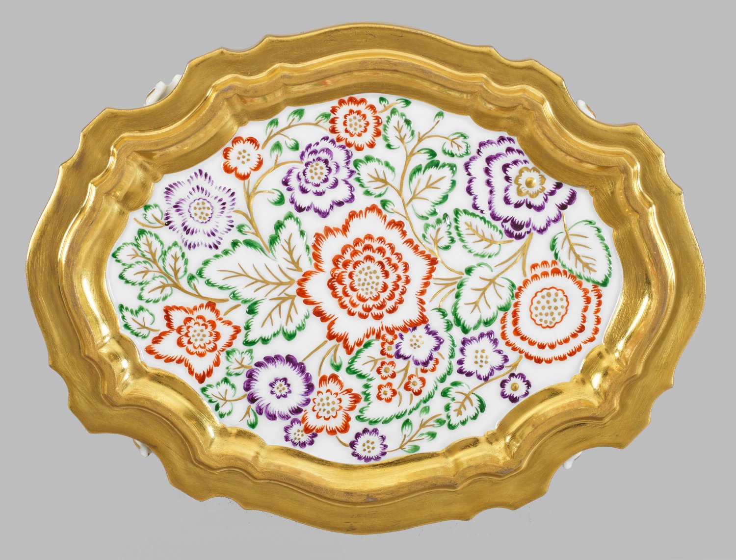 Von vier Tatzenfüßen mit plastischem Adler oval faconnierter, mehrfach verkröpfter, doppelwandiger Korpus, von Bandelwerk durchbrochen gearbeitet. Seitliche Griffe in Gestalt einer Frauenbüste mit Federschmuck, begleitet von kleinen Amoretten. Korrespondierend aufgewölbter, gestufter Deckel mit plastischem Knauf als Königskrone, getragen von zwei Putten. Umlaufend aufgelegte stark reliefplastische Kartuschen mit dem sächsisch-polnischen Wappen im Wechsel mit Jagd- sowie purpurfarbenen Kauffahrteiszenen. Beidseitig der Wandung, zwischen umlaufenden fein modellierten Blumenfestonen und Tuchgehängen, eine palmettenartig bekrönte Rocaillekartusche mit Bergmannsmotiven. Szenische Darstellungen von zwei, in traditionellem Habit gekleideten Bergleuten im Gespräch vor architektur- und baumbestandener Landschaftskulisse. Deckelinnenseite mit farbig staffiertem Blütenrelief. Feine polychrome Malerei mit reichem Golddekor. Innenwandvergoldung. Entw. Johann Joachim Kaendler, 1738. Modell-Nr. 81615. Schwertermarke. H. 21 cm.