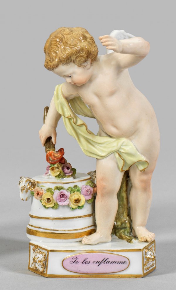 Devisenkind Dreiseitiger Sockel mit Rosetten, bez. "Je les enflamme". An einem Säulenstumpf mit Widderköpfen und Blumengirlande stehende Amorette, ein Herz mit einer Fackel entflammend. Polychrome Malerei mit Goldkonturierung. Entw. Michel Victor Acier. Modell-Nr. F 4. Minim. best.; Unw. rest.; Schwertermarke. H. 13 cm.