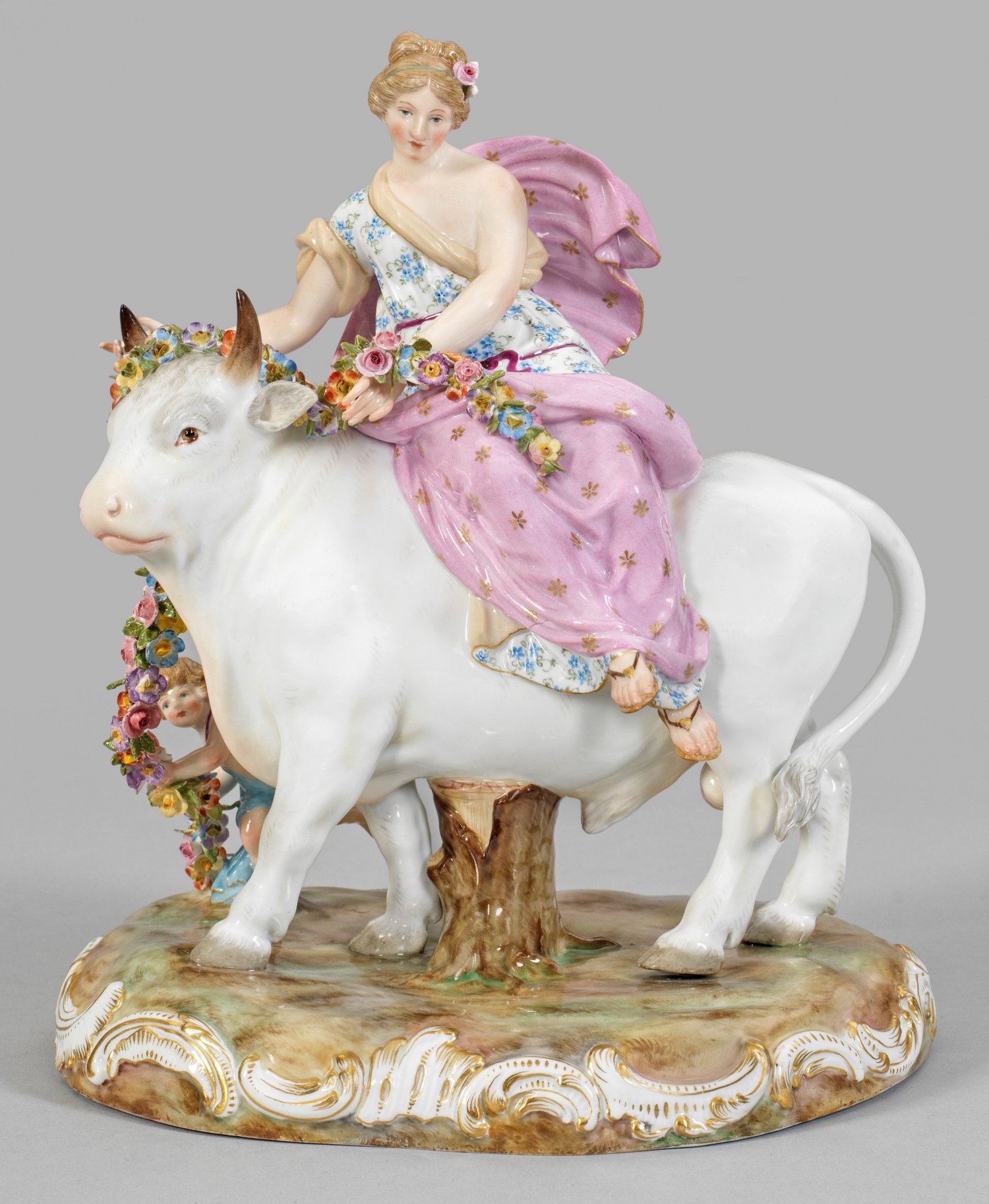 Figurengruppe "Europa auf dem Stier". Originaltitel Über rocaillereliefiertem, naturalistisch staffiertem Sockel, auf einem Stier sitzende Europa in geblümtem, antikisierendem Gewand und rosafarbenem, goldornamentiertem Tuch in Begleitung eines Puttos, eine Blumengirlande um das Tier legend. Polychrome Malerei mit Goldstaffage. Entw. Christian Gottfried Jüchtzer. Minim. rest.; Schwertermarke. H. 24 cm. 20,5 cm x 16,5 cm.