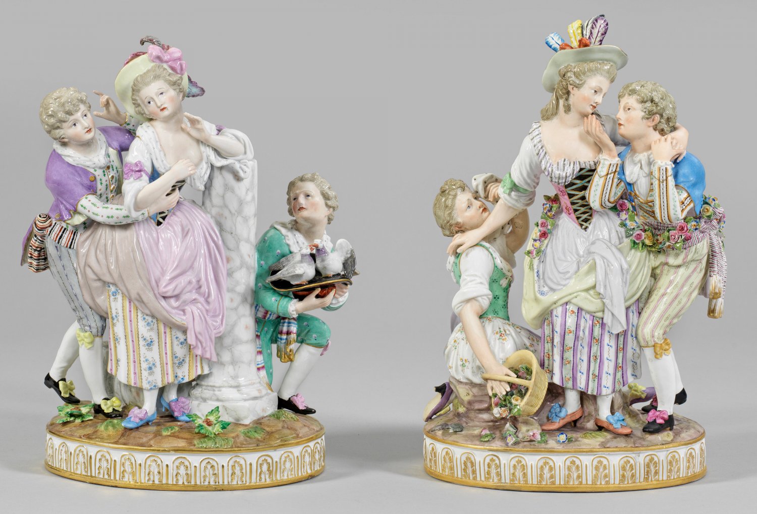 Ovaler Sockel mit reliefierter Akanthusblattbordüre. Stehende Dame in reich gemustertem Kleid mit Federhut, einen jungen Kavalier umarmend, seitlich sitzendes, aufschauendes Mädchen mit Blumenkorb, sich die Tränen trocknend bzw. eine sommerlich gekleidete, junge Dame, von einem herannahendem Kavalier überrascht. Hinter einer Marmorsäule kniender Jüngling als Beobachter, einen schwarzen Hut mit Tauben haltend. Polychrome Malerei mit Goldstaffage. Entw. Johann Carl Schönheit. Rest.; Schwertermarke. H. 31 cm - 32,5 cm.