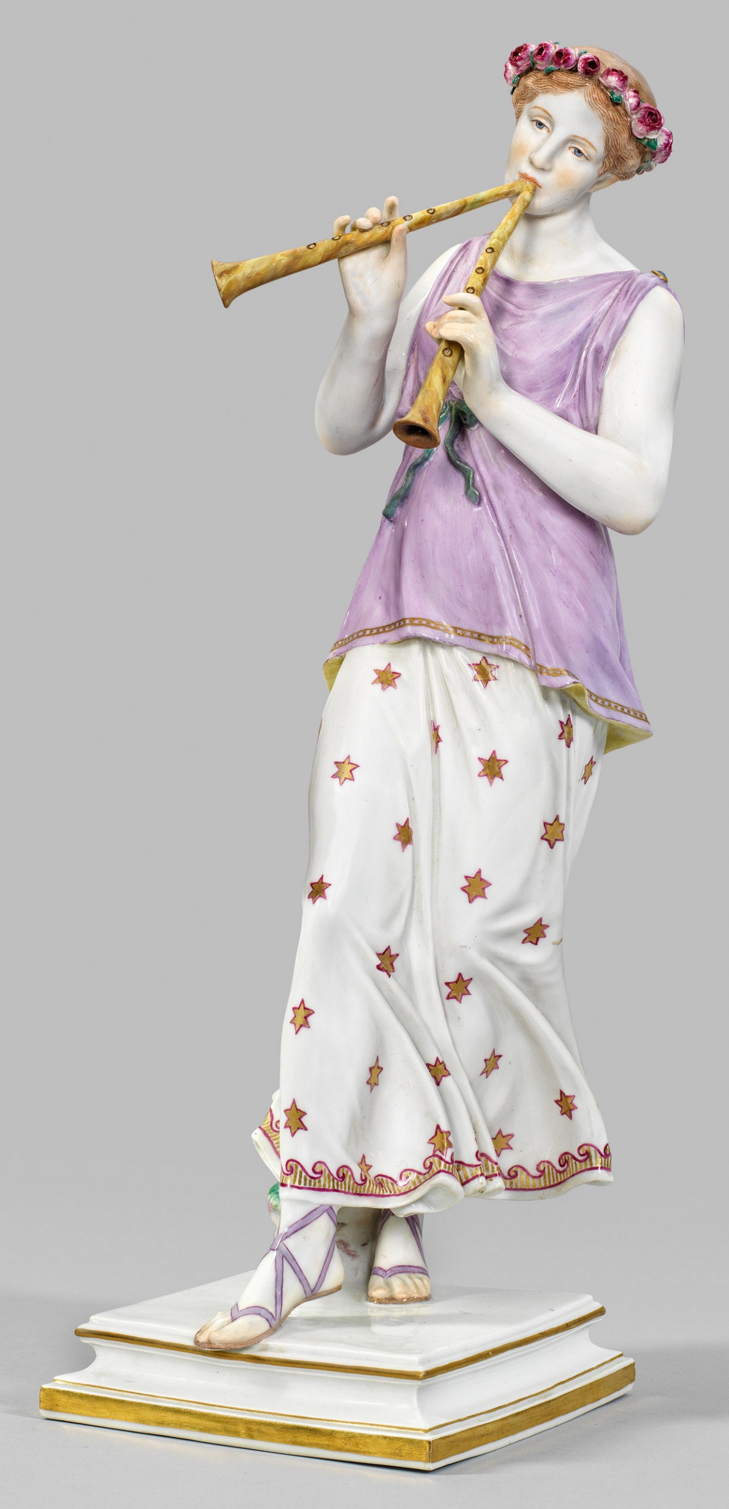Große seltene Figur einer Tibiaspielerin Auf quadratischem, profiliertem Sockel, in Tanzhaltung stehende antikisierende, junge Dame in goldgesäumtem, purpurfarben-weißem Gewand mit Sternenmuster, eine Doppelflöte spielend. Ihr hellbraunes, zum Knoten zurückgebundenes Haar von einem Rosenkranz bekrönt. Polychrome Malerei mit Goldstaffage. Entw. wohl Johann Christian Hirt. Modell-Nr. N 159. Minim. best.; Unw. rest.; Schwertermarke. H. 46 cm.