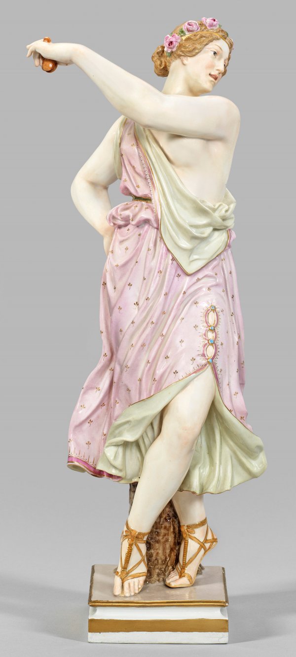 "Tänzerin".Originaltitel Auf quadratischem, profiliertem Sockel vollplastische Darstellung einer antikisierenden, in tänzerischer Pose stehendenjungen Frau in roséfarbenem, von kleinen Goldblüten gemustertem Gewand, das Haar von Rosen und einem Goldreif geschmückt. In den Händen Kastagnetten haltend. Polychrome Malerei mit Goldkonturierung. Entw. Ernst Julius Hähnel, um 1877. Modell-Nr. L 171. Rest.; Schwertermarke. H. 48 cm.