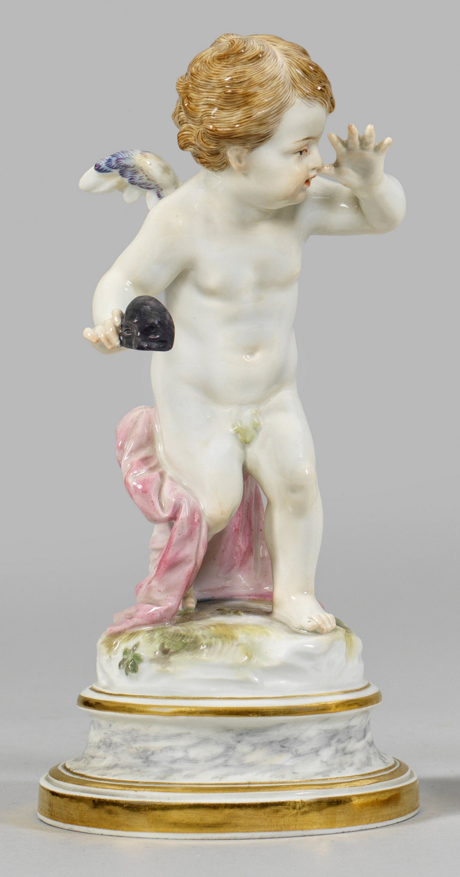 "Amor mit Maske, eine lange Nase drehend". Originaltitel Auf profiliertem Rundsockel stehender Amor mit einer Maske, sich mit der linken Hand zum Spott an die Nase fassend. Polychrome Malerei mit Goldstaffage. Entw. Heinrich Schwabe. Modell-Nr. L 110. Minim. rest.; Schwertermarke. H. 19 cm.