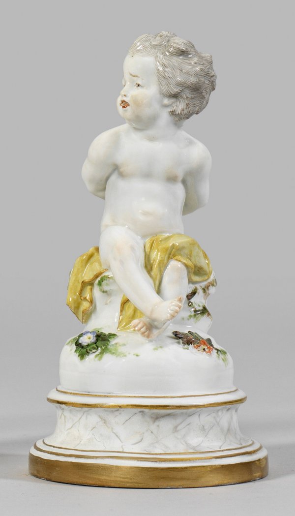 "Amor mit gebundenen Händen und Flügeln". Originaltitel Auf profiliertem Rundsockel sitzender Amor mit erhobenem Kopf und auf dem Rücken gefesselten Händen. Polychrome Malerei mit Goldstaffage. Entw. Heinrich Schwabe. Modell-Nr. L 102. Rest.; Schwertermarke. H. 17 cm.