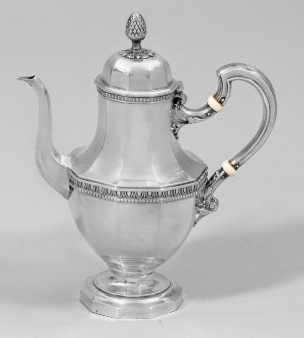 Kleines Schenkkännchen im Empirestil. Silber. Über flachem Stand gebauchter, zehnseitig facettierter Korpus mit schlankem Hals, aufgewölbtem Deckel und Pinienknauf. Mittig angesetzter Ausguss, Volutenhenkel minim. best.; Gest., Beschaumarke, Meister Rudolphe Beunke (wird Meister 1888). Gew. ca. 295 g. H. 18,5 cm.