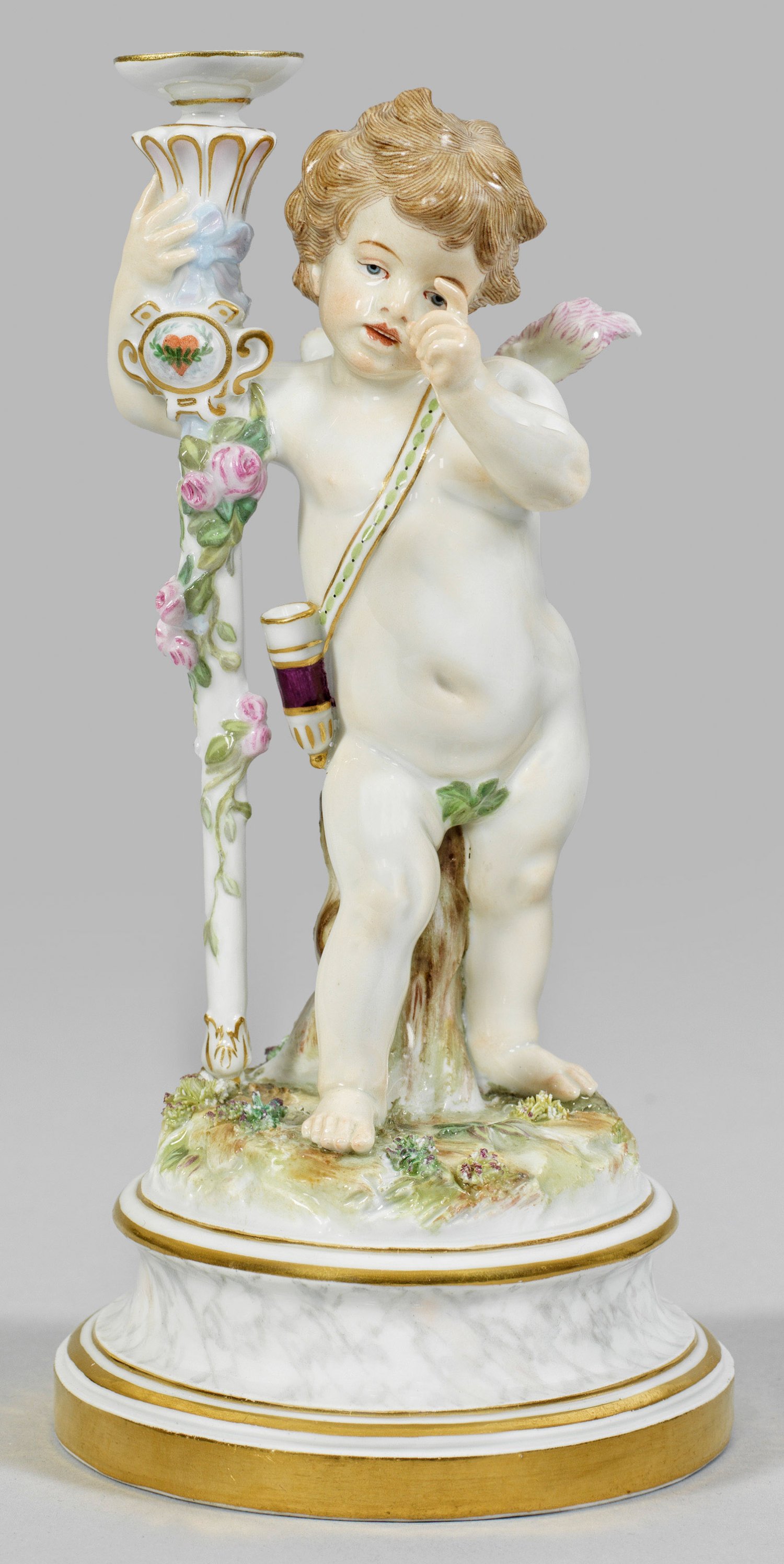 "Amor mit Rosenstab". Originaltitel Auf profiliertem Rundsockel stehender Amor, die linke Hand mit erhobenem Zeigefinger. Die Rechte einen langen, von Rosenranken umzogenen Stab haltend. Polychrome Malerei mit Goldstaffage. Entw. Heinrich Schwabe. Modell-Nr. L 126. Minim. best./rest.; Schwertermarke. H. 19 cm.