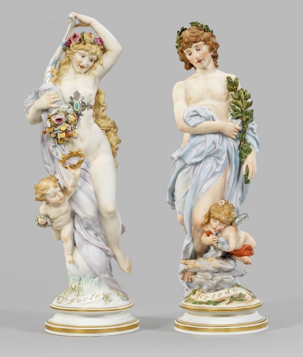 Profilierter Rundsockel. Auf naturalistisch gestaltetem, mit Blütenzweigen belegtem Terrain antikisierende, vollplastische Darstellung eines Mädchens mit langem, faltenreichen Tuch mit historisierendem, schmuckbesetztem Gürtel. Das lange, gewellte blonde Haar von einem Rosenkranz bekrönt. An der rechten Schulter mit beiden Händen ein mit Rosenblüten, Münzen, Muscheln und Korallenzweigen gefülltes Horn haltend. Zu ihrer Seite ein Putto mit Lorbeerkranz und Krone. Als Gegenstück ein Jüngling mit großem Lorbeerzweig in Begleitung einer zwischen Wolken schwebenden Amorette, in den Händen eine Taube haltend. Polychrome, zarte pastelltonige Malerei mit Goldstaffage. Entw. Heinrich Schwabe, 1883. Sockel bez. „Fortuna“ und „Friede“. Entw.-Bez.; Modell-Nr. M 188 und M 187. Schwertermarke. H. 60 cm - 62 cm.