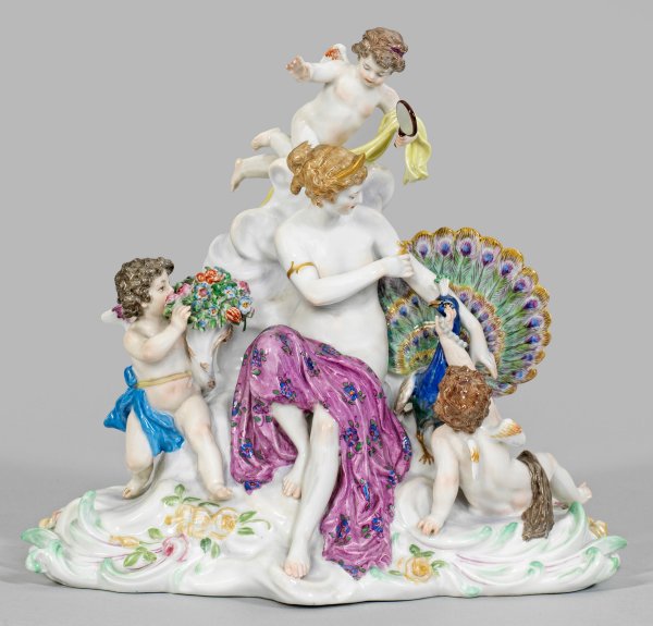 Allegorische Figurengruppe "Die Luft". Originaltitel Auf einem, von reliefierten Blüten und Ranken umzogenen Wolkensockel sitzende, von einem goldenen Diadem bekrönte Juno mit purpurfarbenem, von Blumen verziertem Tuch, sich dem seitlich stehenden, farbenprächtigen Pfau zuwendend. Flankiert von zwei Amoretten, ein Horn mit Blumen bzw. eine Perlenkette haltend. Über der Göttin schwebender Putto mit Spiegel. Polychrome Malerei mit wenig Gold. Entw. Paul Helmig, 1892. Modell-Nr. O 199. Schwertermarke. H. 22 cm.