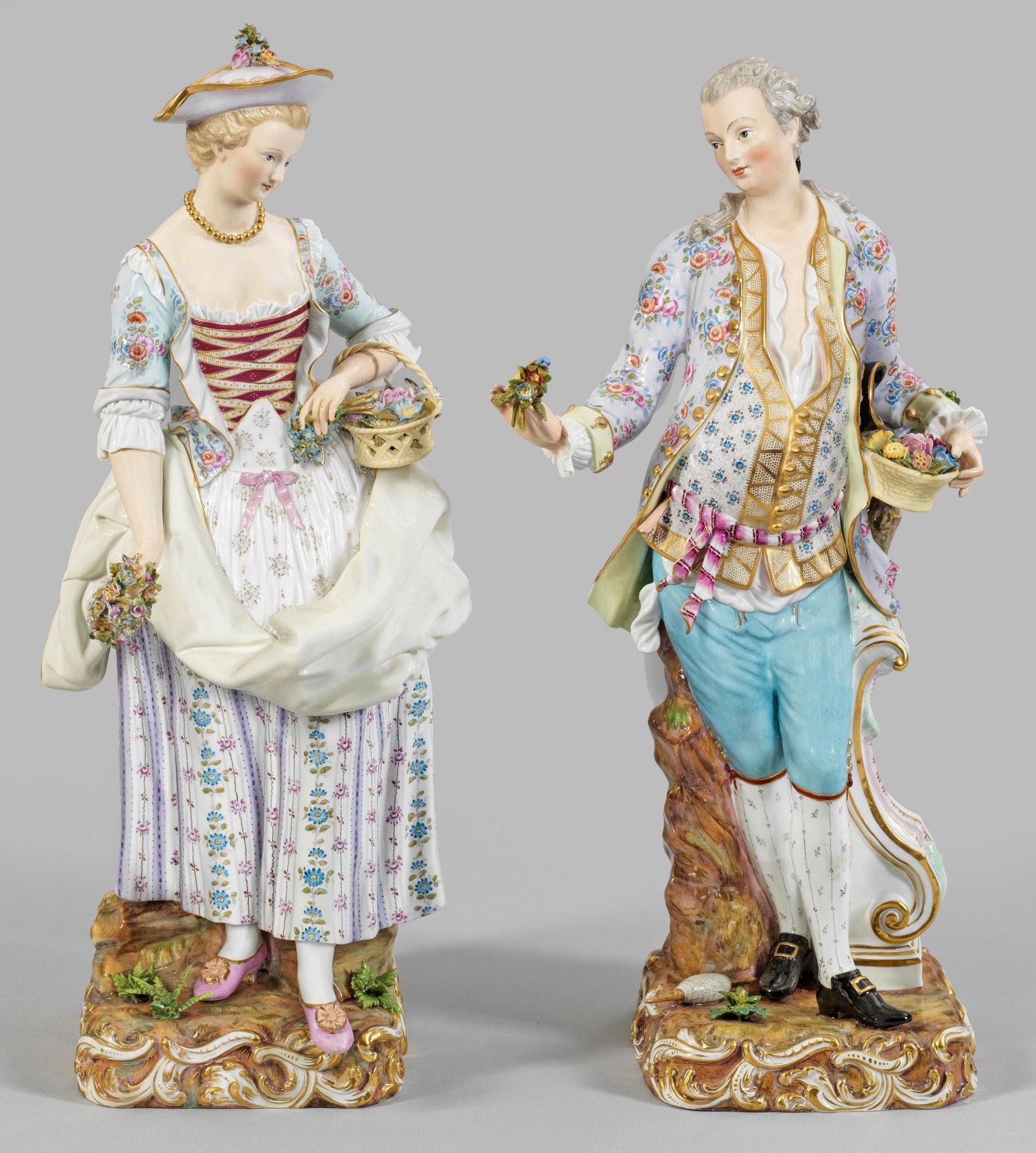 Paar außergewöhnlich große Gärtnerfiguren Auf quadratischem, naturalistisch gestaltetem und von reliefierten Rocaillen umzogenem Sockel stehende junge Dame in sommerlichem Kleid und Hut, in ihrer rechten Hand einen Blumenkranz, in der Linken einen Blumenkorb haltend. Als Gegenstück ein, an einer Volutensäule stehender Kavalier mit Korb und Blumenstrauß. Polychrome Malerei mit Goldstaffage. Entw. Johann Carl Schönheit. Modell-Nr. B 65, 2868. Unw. rest.; Schwertermarke. H. 49 cm - 51 cm.