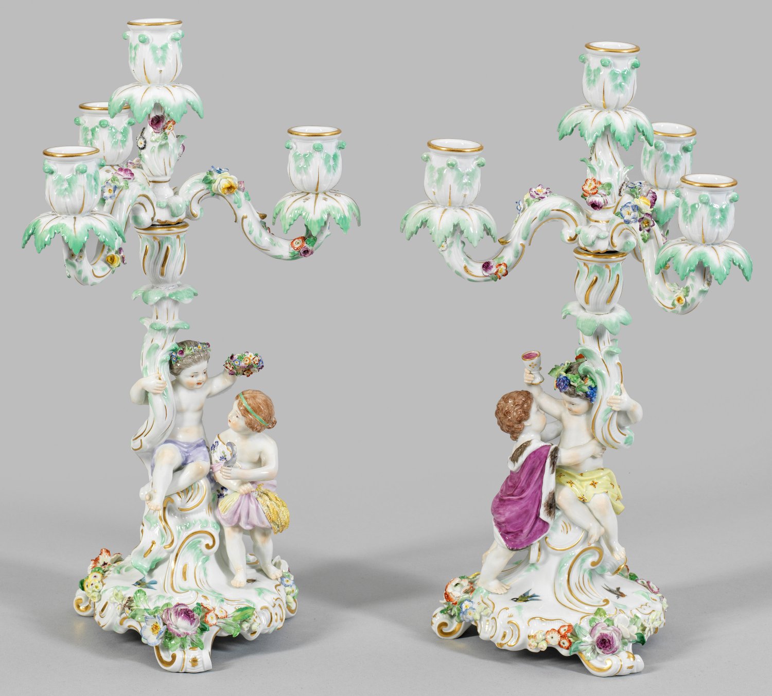 Gegenstücke. 1-bzw. 4-flg.; Runder, von Volutenfüßen getragener und von plastisch aufgelegten Blüten umzogener Rocaillesockel, in aufsteigenden, blattförmigen Schaft und blütenartige Tülle übergehend. Abnehmbarer Leuchteraufsatz mit drei geschwungenen, korrespondierenden Leuchterarmen. Schauseitiges Puttenpaar mit Blütenkranz, Sichel und Ähren, Trauben und Weinpokal sowie Pelzmantel, den Frühling und Sommer bzw. Herbst und Winter symbolisierend. Dezenter Vogel- und Insektendekor. Polychrome Malerei mit Goldstaffage. Entw. Ernst August Leuteritz. Modell-Nr. H 196a und b. Unw. rest.; Schwertermarke. H. 27 cm - 41 cm.