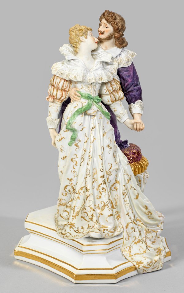 Auf achteckigem, passig geschweiftem Profilsockel stehendes, sich umarmendes Liebespaar in Renaissancekostüm. Junge Dame in langem, weißem, goldornamentiertem Kleid mit grünem Gürtel, sich zu dem hinter ihr stehenden Geliebten umdrehend. Junger, sich auf einen Prunkhocker stützender Kavalier in lilafarbenem Anzug. Polychrome Malerei mit Goldstaffage. Entw. Hugo Spieler, 1899. Modell-Nr. S 111. Kleine Brandrisse. Minim. ber.; Unw. rest.; Schwertermarke. H. 32 cm. 19 cm x 19 cm.