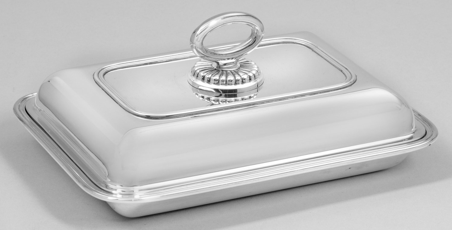 Gemüse-Deckelschale Silber. Rechteckig mit gerundeten Ecken. Gewölbter Deckel mit abnehmbarem Knauf, als Schale verwendbar. Ausschwingender Rand. Gest. 800, Herstellerzeichen. Gew. zus. ca. 1045 g. H. 11,5 cm. 27,2 cm x 19,8 cm.