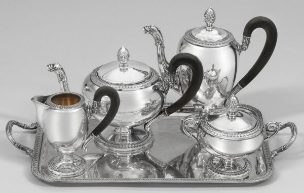 Kaffee- und Teeservice im Empirestil Silber. 5-tlg.; Kaffee- und Teekanne, Zuckerdose, Sahnegießer sowie Tablett. Fuß getreppt, umzogen mit Fries aus reliefiertem Blattkranz. Ovoider, glatter Korpus. Tief angesetzter, geschwungener Röhrenausguss mit Tierkopf. Kannen mit ebonisierten Ohrenhenkeln. Gest. 800, 20AL, Herstellerzeichen. Gew. zus. ca. 2500 g.