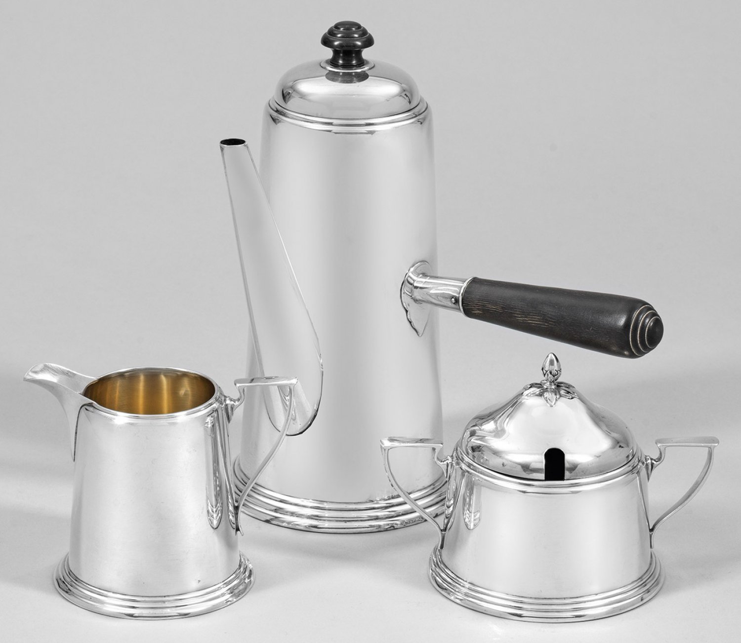 Kaffeeservice Silber. 3-tlg.; Kaffeekanne, Sahnegießer und Zuckerdose. Über dreifach profiliertem Stand sich konisch verjüngender, glatter Korpus mit seitlichem Griff aus ebonisiertem Holz. Teilw. innen vergoldet. Milchkännchen minim. best.; Gest. Sterling. Gew. zus. ca. 730 g.
